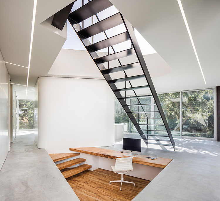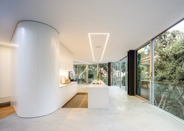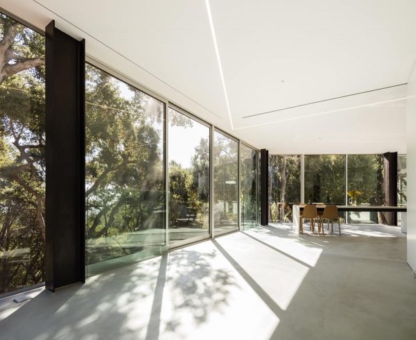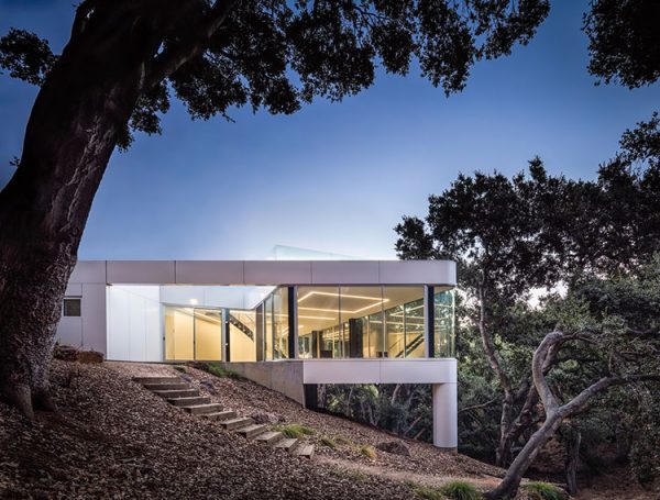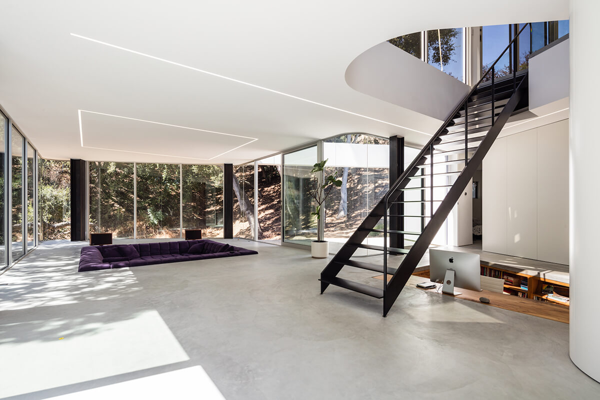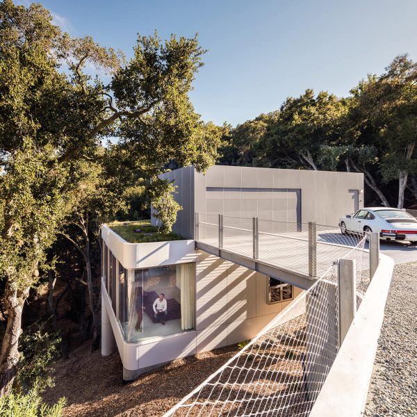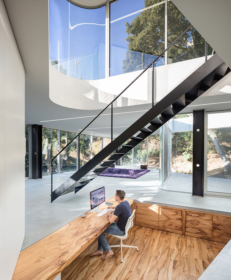A bridge of steel grating connects grade to the rooftop of native grasses. An observation deck sits in the grass field along with a garage/foyer of zinc panels and mirror glass. Abundant natural light funnels down through the foyer pouring puddles of light into the living level. The main living area is nestled into the tree canopy while bedrooms, bathrooms, service, and storage are located behind a long wall of cabinetry along the hillside. Distinct spaces (the living room, the office, and the kitchen) are delineated spatially in the open plan by layering them into the polished concrete floor.