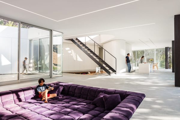 Minimalism is the Mantra. In the sunken office, all surfaces— flooring, desk, and cabinetry— are milled from a single slab of Chinese pistachio. The sunken living room is filled with bespoke puffy purple pillows, like a posh trampoline! In the kitchen/dining room, an extravagantly long counter of white composite quartz continues the kitchen work surface into the dining table. In the ceiling, flush mounted LED strips illuminate to articulate these zones.