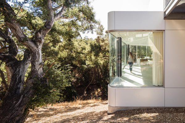 The concept for this radical, revolutionary house came into focus clearly and quickly— float a glass box in the leaves of the trees on two trunk-like columns, disrupting as few oaks as possible. The lush foliage surrounding the structure offers the opportunity to build a complete glass-walled house, protected from the direct rays of the sun, yet filled with dappled sunlight. Like being on your own private planet!