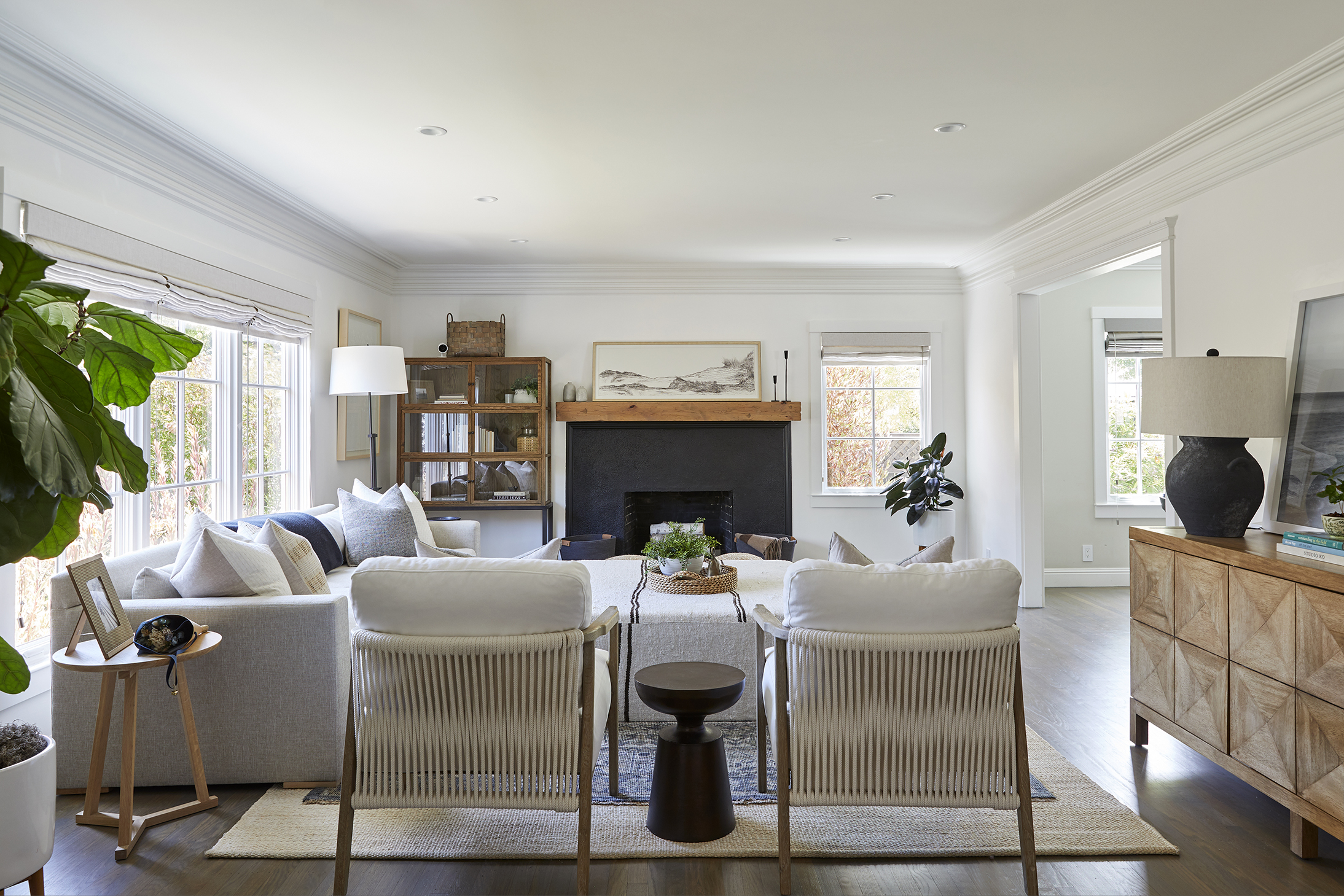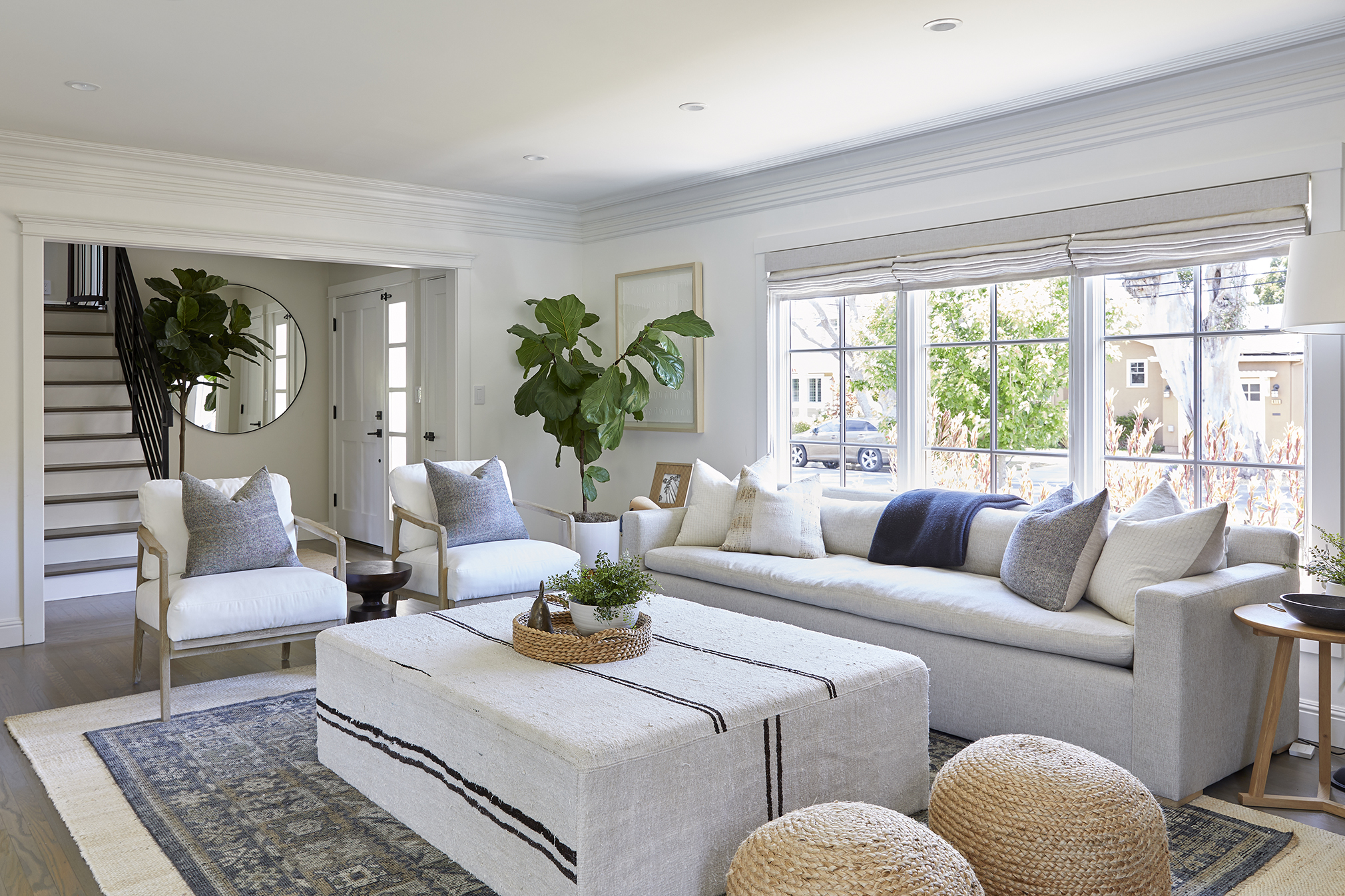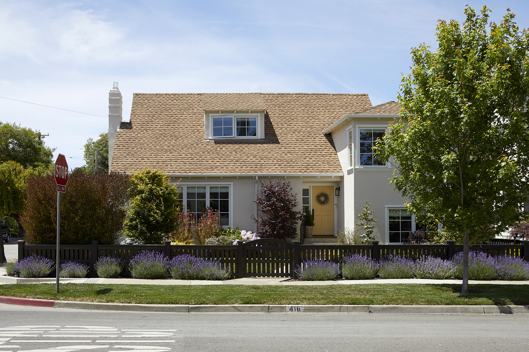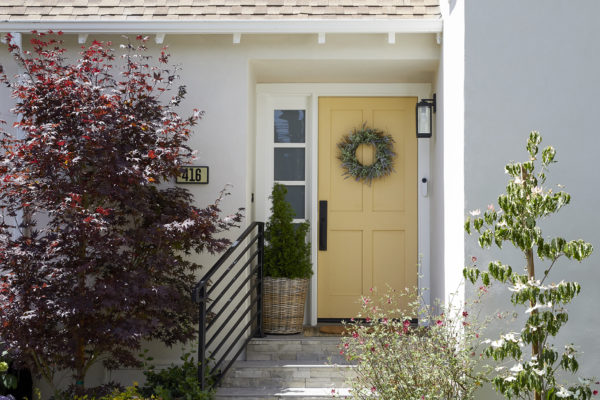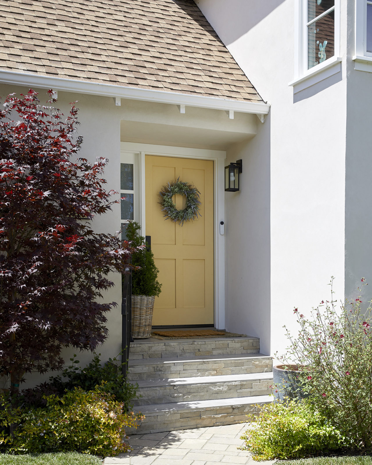 A yellow front door welcomes you into a traditional family home with casual elegance.
