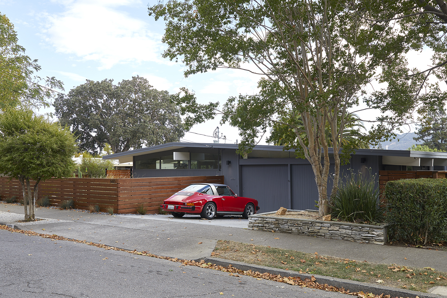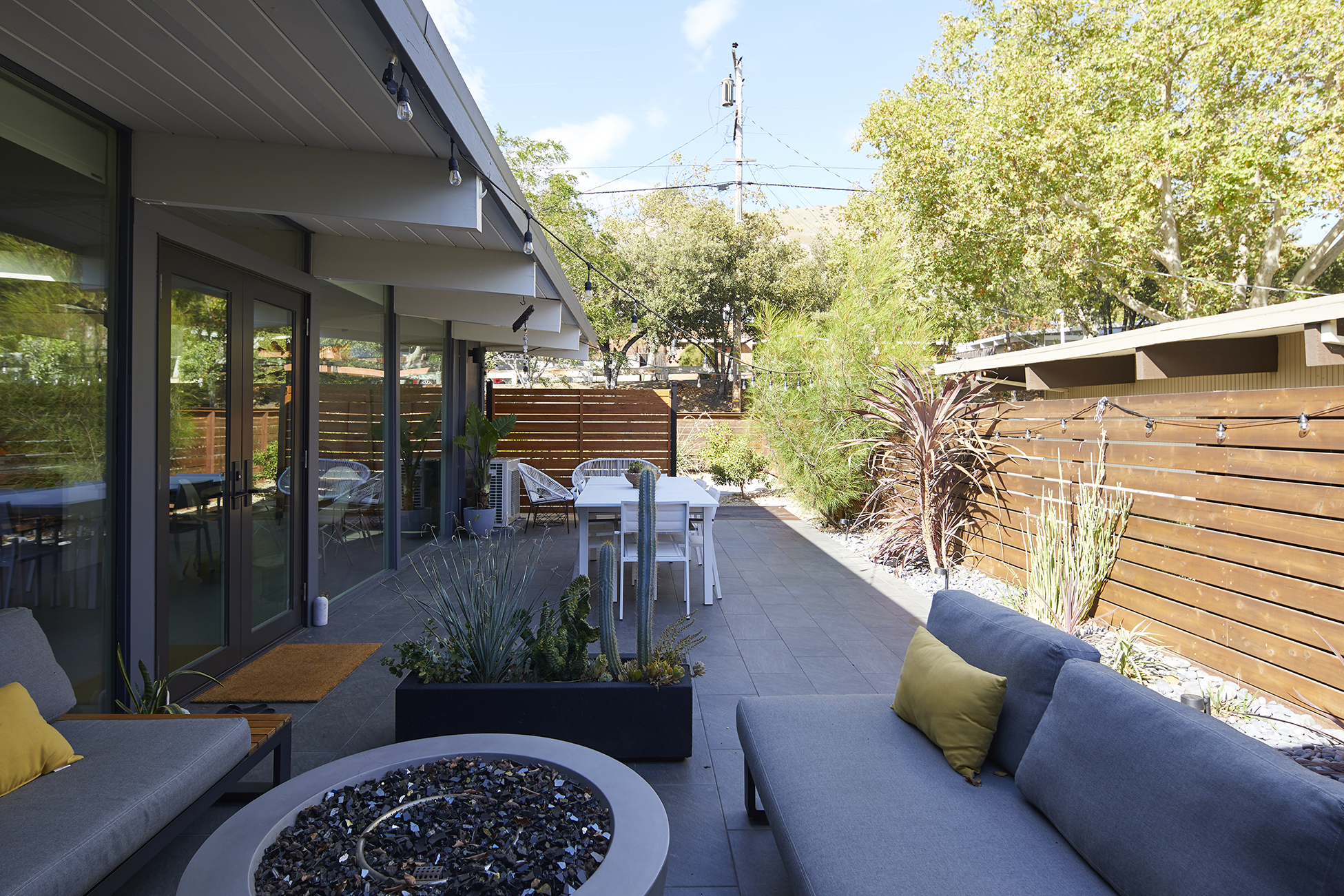 The completely remodeled galley style kitchen opens to the dining area and boasts beautiful new quartz countertops, new cabinetry with tons of storage and brand-new stainless-steel appliances. Many desirable Eichler details remain intact such as Philippine Mahogany walls, globe lighting, walls of glass and Shoji sliding closet doors. Ideal for entertaining, the open concept living room with a gas fireplace and adjoining family/ dining area opens to the landscaped patio, providing an extension of the indoors to the outside. The primary bedroom features a updated en suite bath. There are multiple nooks to enjoy the outdoors, whether entertaining guests on your landscaped side patio, or dining al fresco on your expansive rear patio. The terraced yard features sensational views from the top.