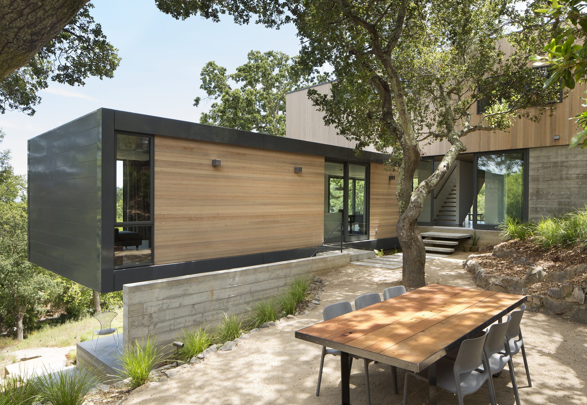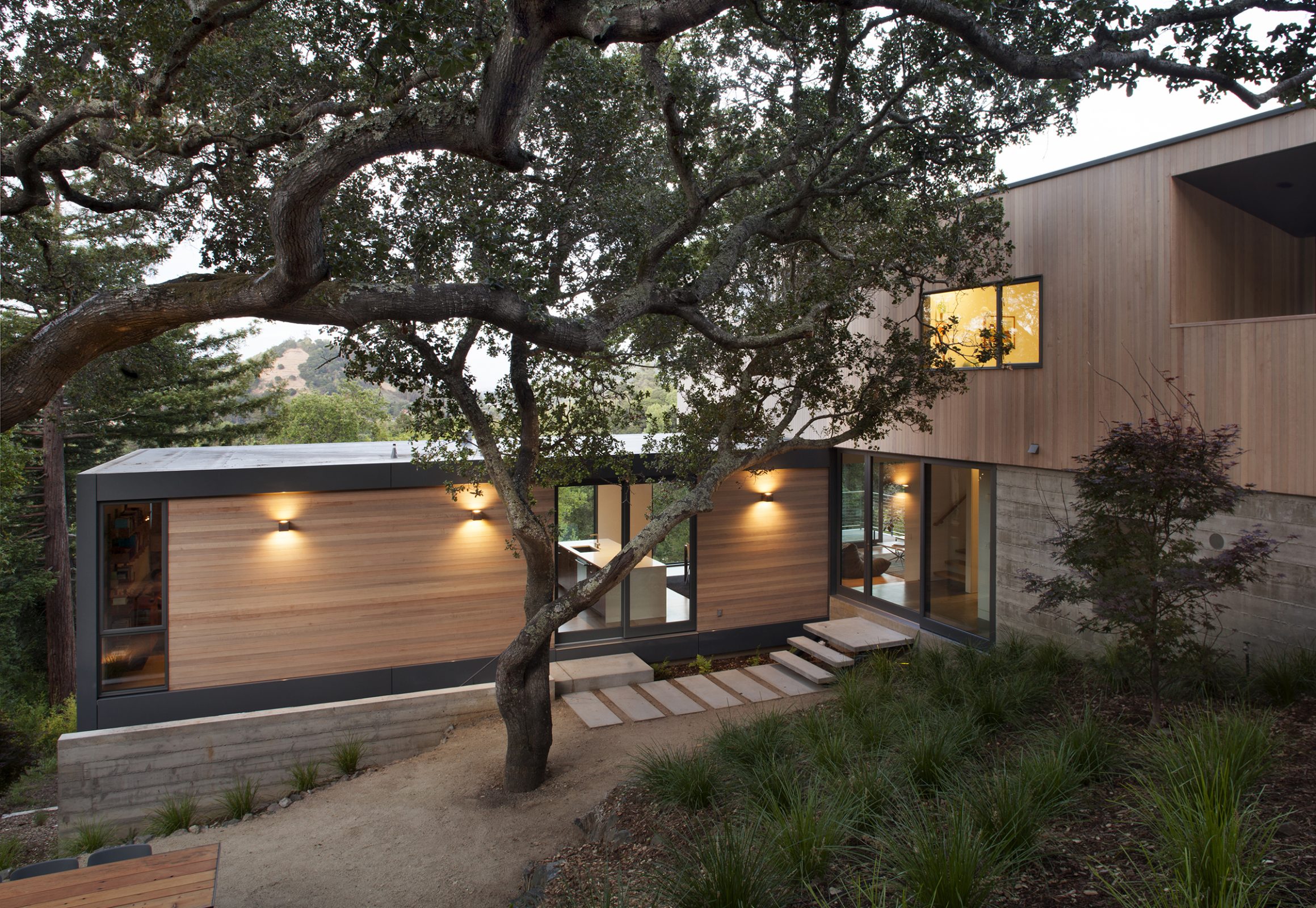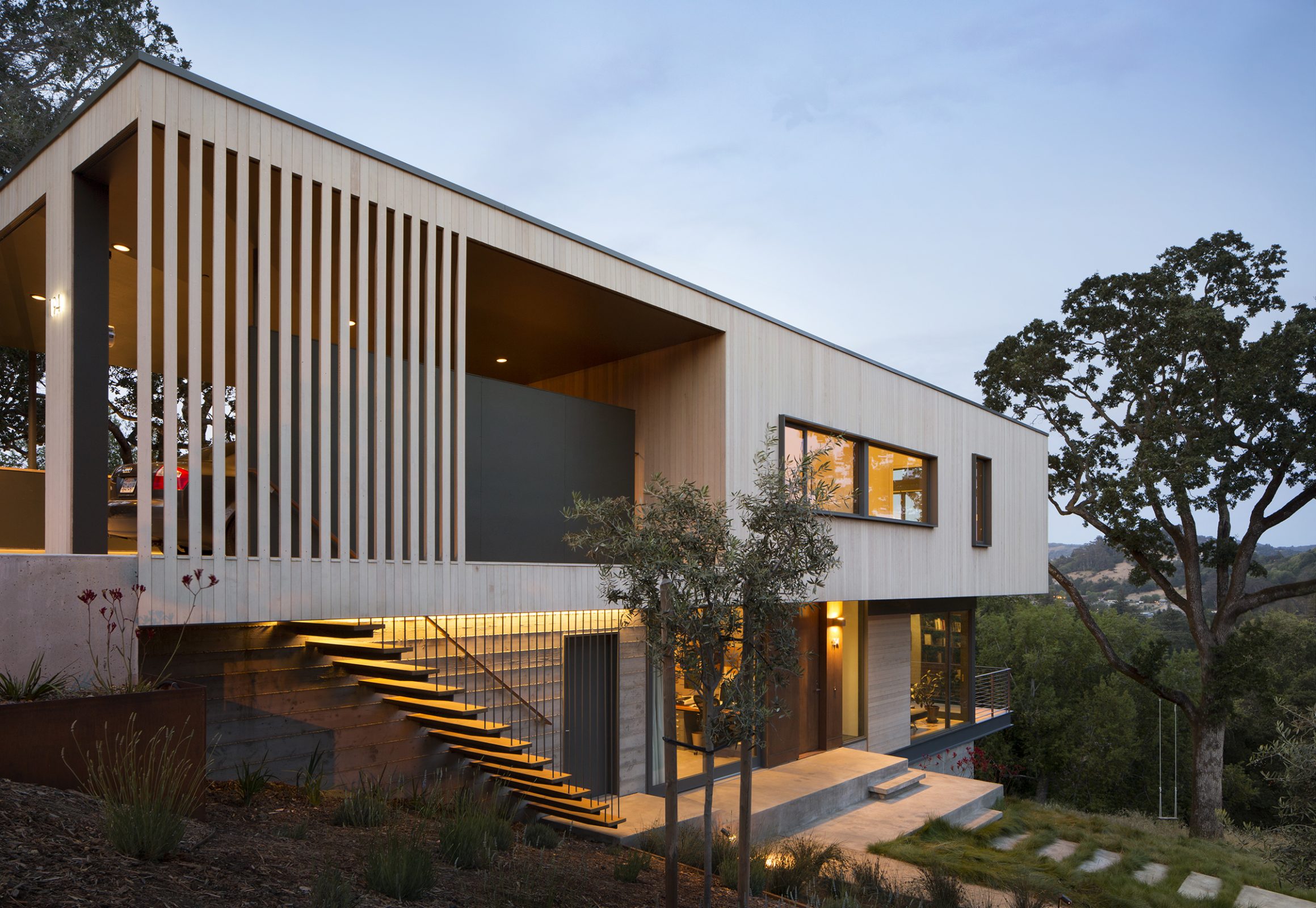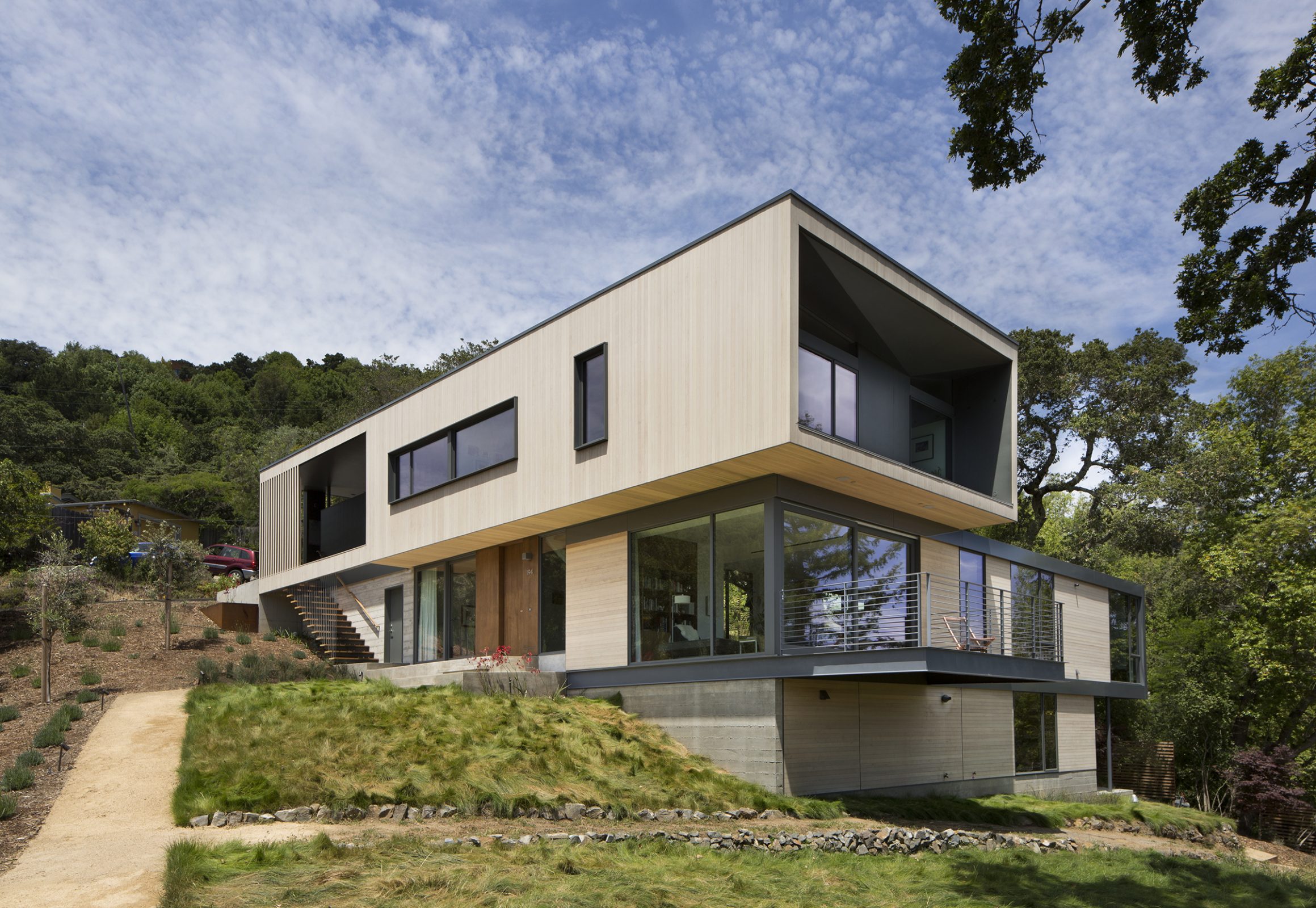 Envisioned for direct access to the outdoors and visual connection to the surrounding landscape, this 2,450 sq. ft. house was designed as two perpendicular volumes stepping down the hill. The expansive windows and sliding glass doors allow for the exterior patio and cantilevered deck to be an extension of the living spaces. The Upper Level cantilevers over the Lower Level on the South side utilizing passive heating and cooling strategies. The Upper Level was also designed with an inverted hip roof to maximize exposure for solar panels while visually concealing them from the street.