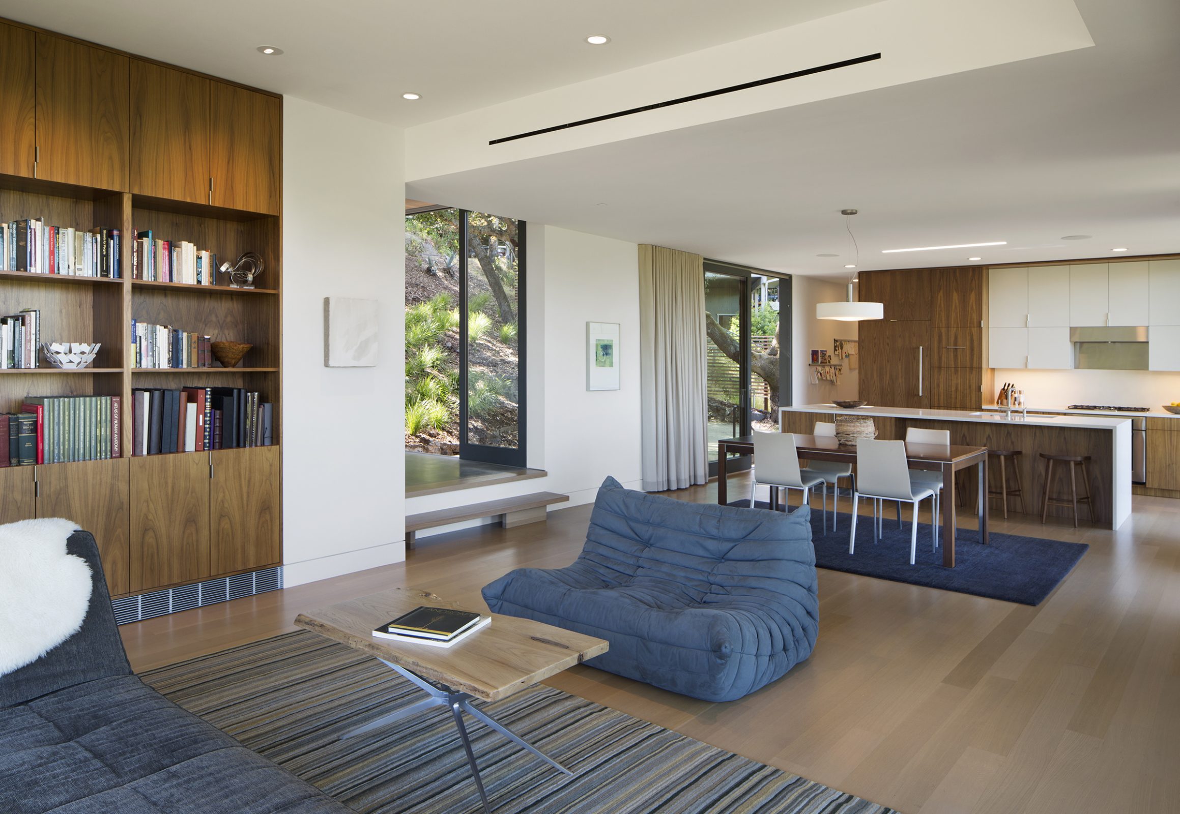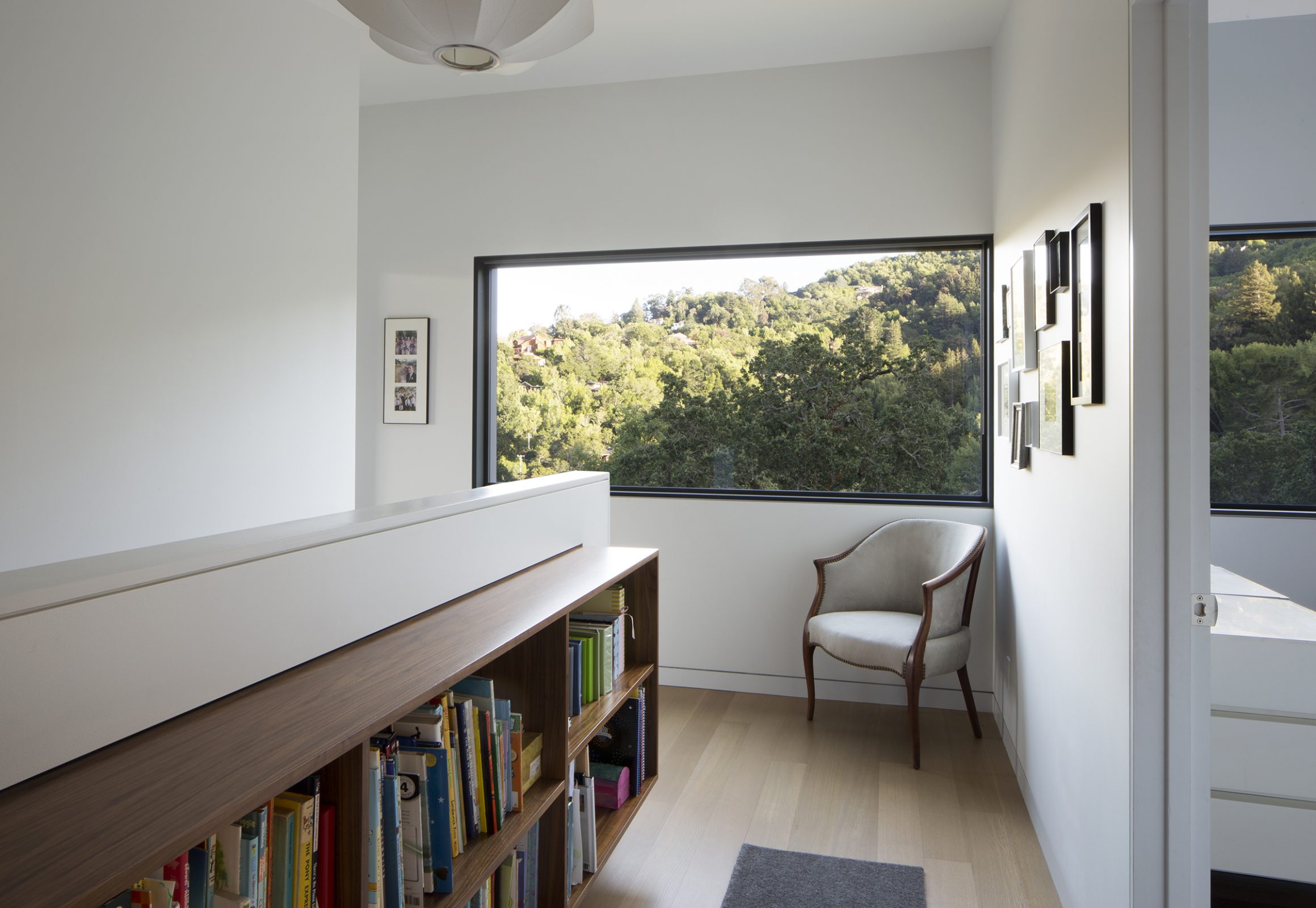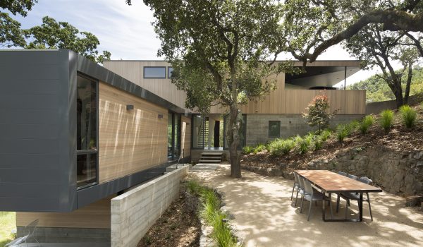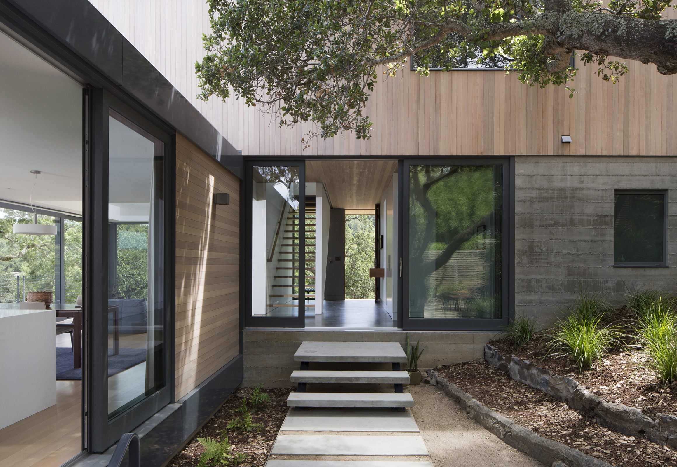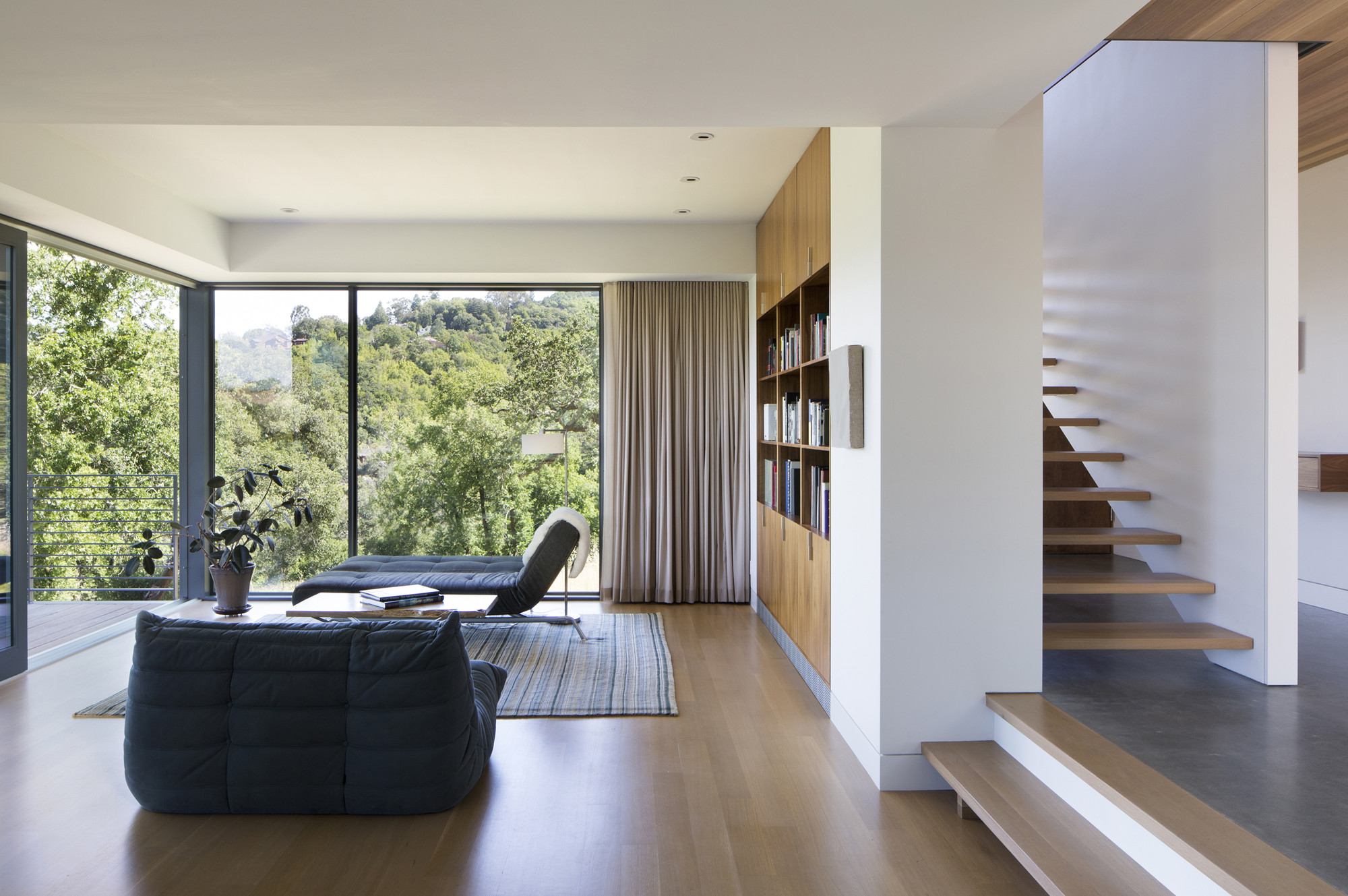 Envisioned for direct access to the outdoors and visual connection to the surrounding landscape, this 2,450 sq. ft. house was designed as two perpendicular volumes stepping down the hill. The expansive windows and sliding glass doors allow for the exterior patio and cantilevered deck to be an extension of the living spaces. The Upper Level cantilevers over the Lower Level on the South side utilizing passive heating and cooling strategies. The Upper Level was also designed with an inverted hip roof to maximize exposure for solar panels while visually concealing them from the street.