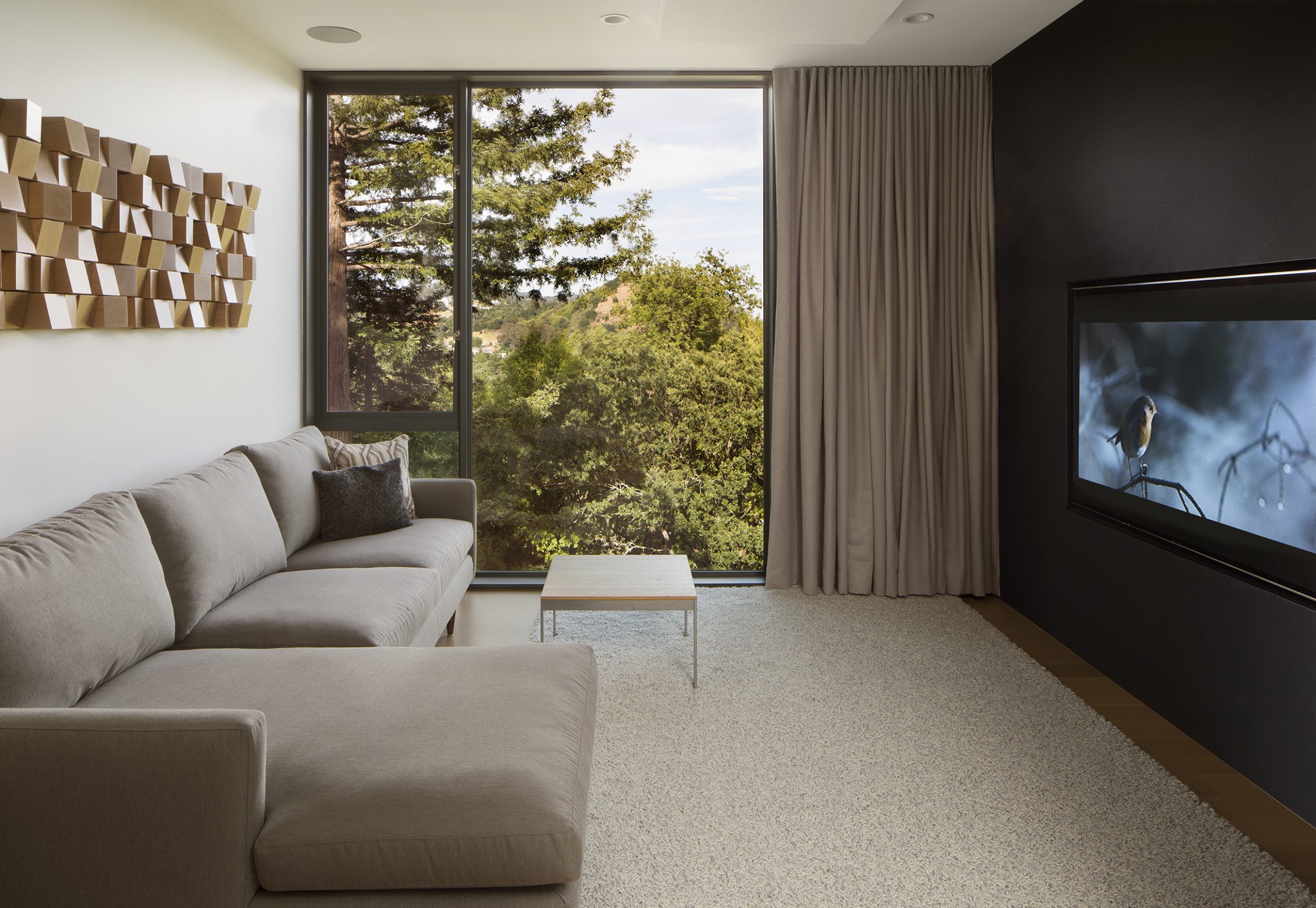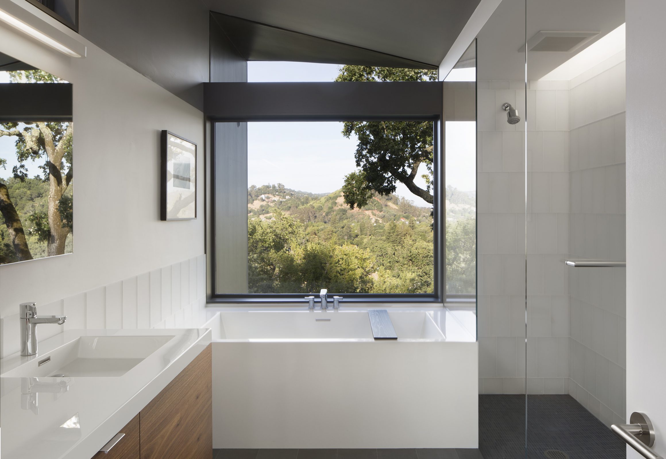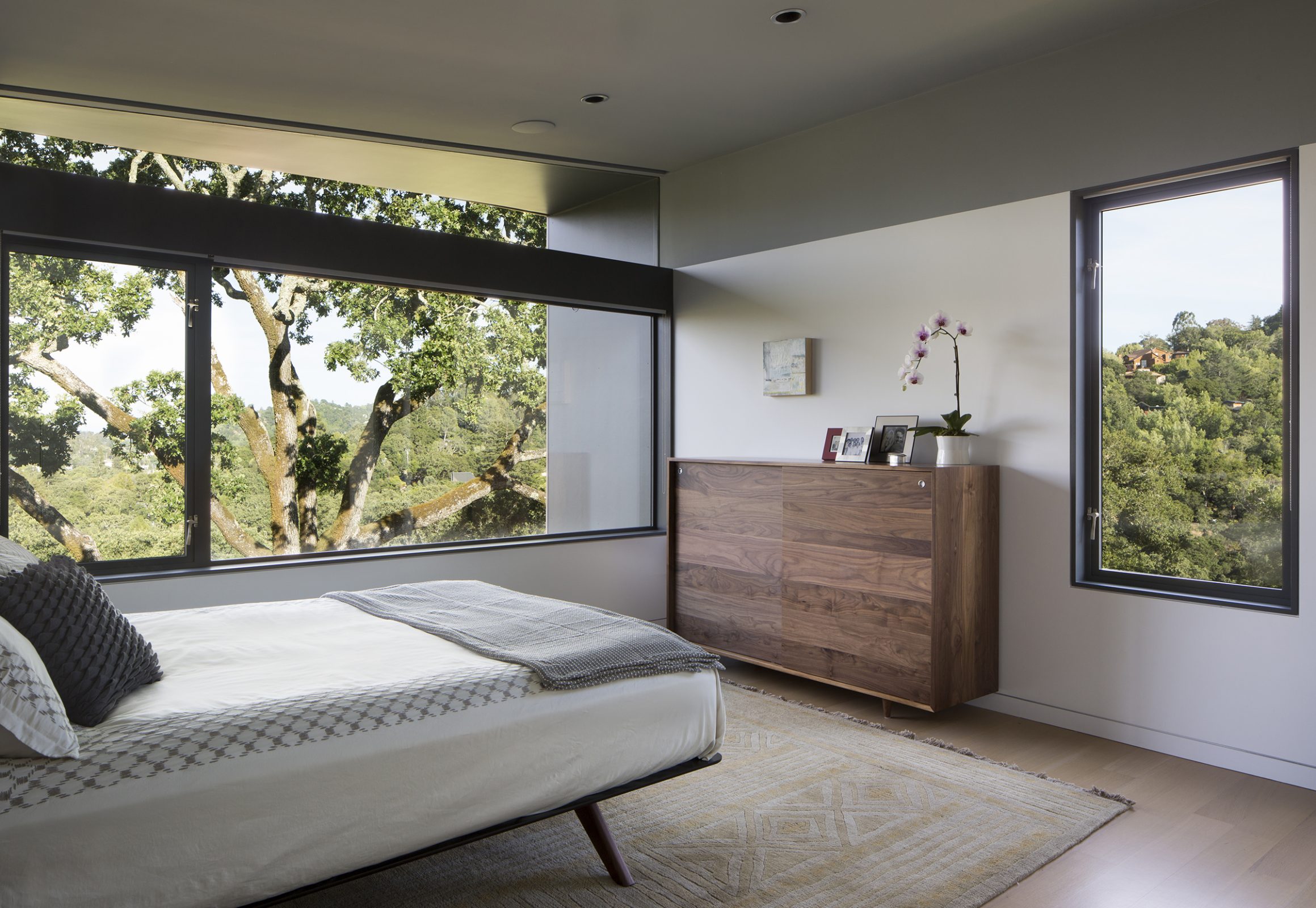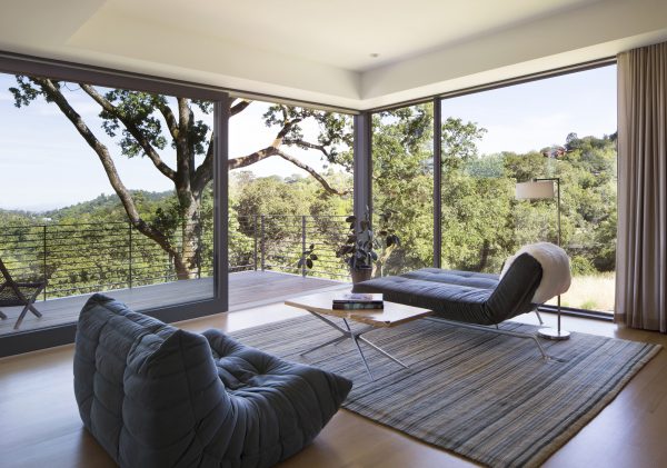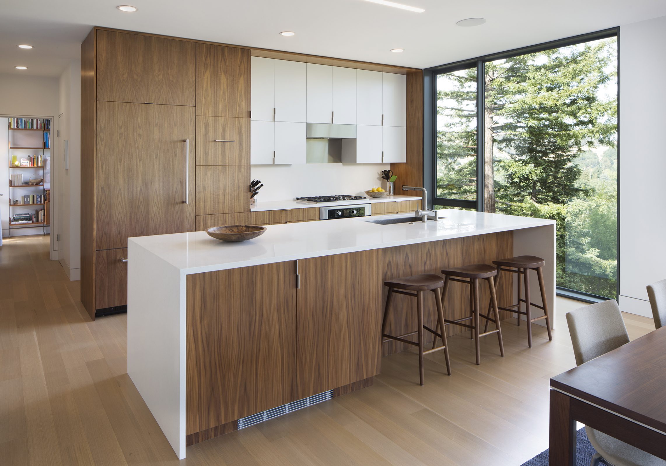 Envisioned for direct access to the outdoors and visual connection to the surrounding landscape, this 2,450 sq. ft. house was designed as two perpendicular volumes stepping down the hill. The expansive windows and sliding glass doors allow for the exterior patio and cantilevered deck to be an extension of the living spaces. The Upper Level cantilevers over the Lower Level on the South side utilizing passive heating and cooling strategies. The Upper Level was also designed with an inverted hip roof to maximize exposure for solar panels while visually concealing them from the street.