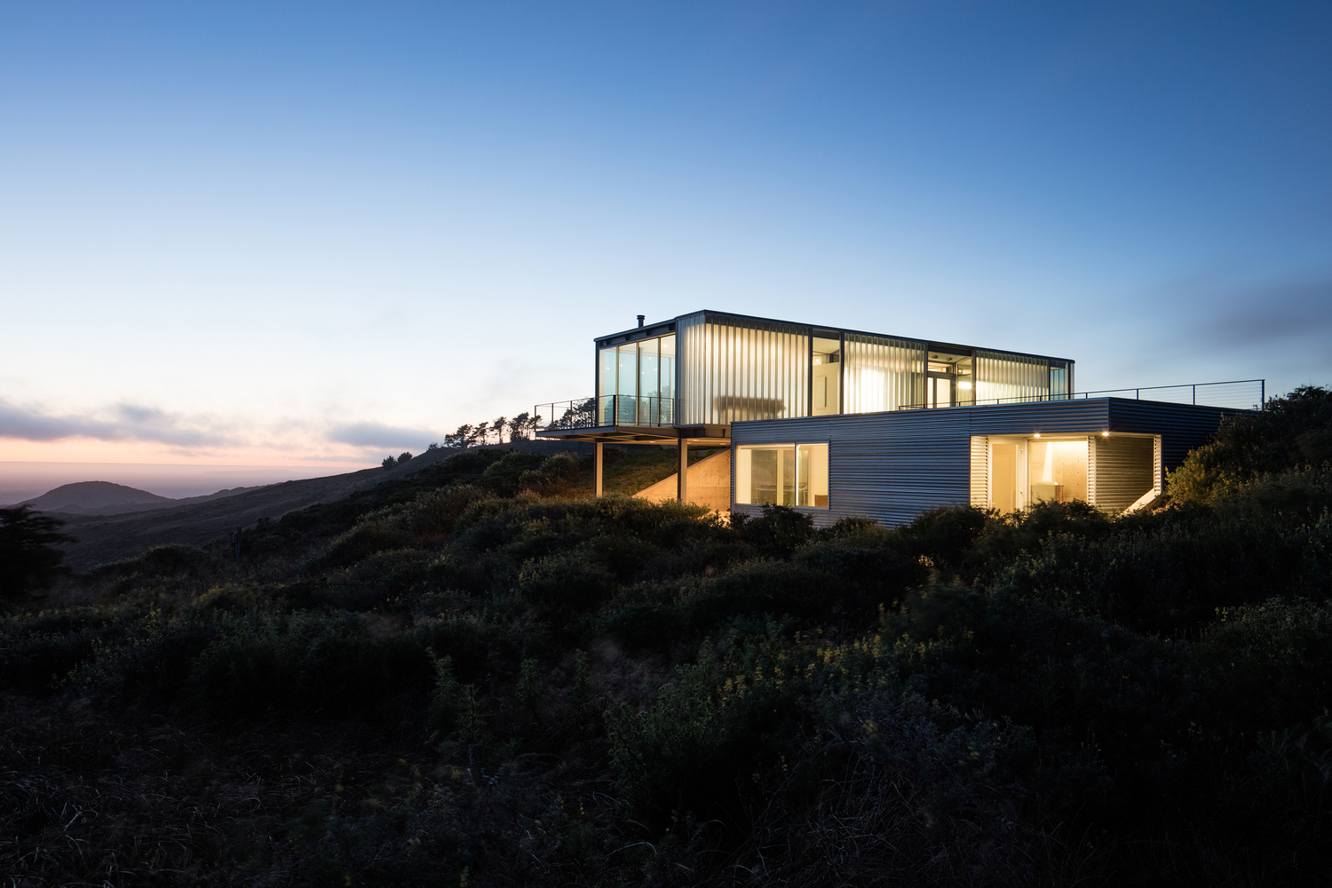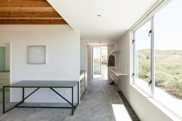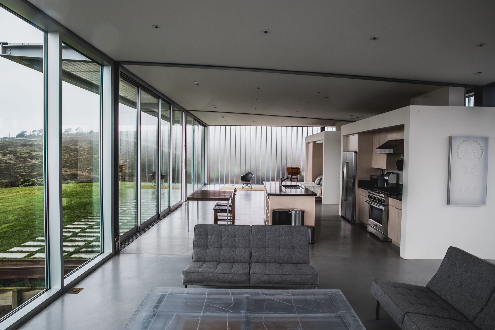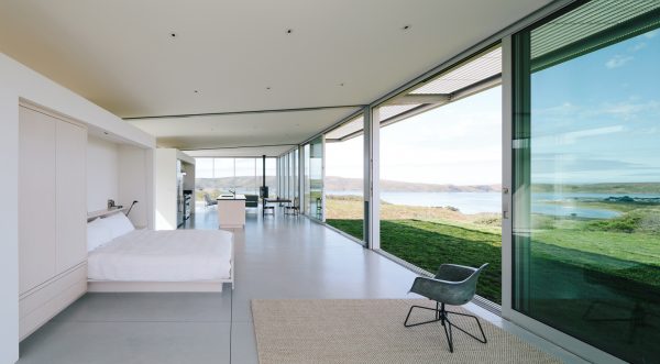 A modern all glass home with a crisp white interior and sweeping views of Tomales Bay.