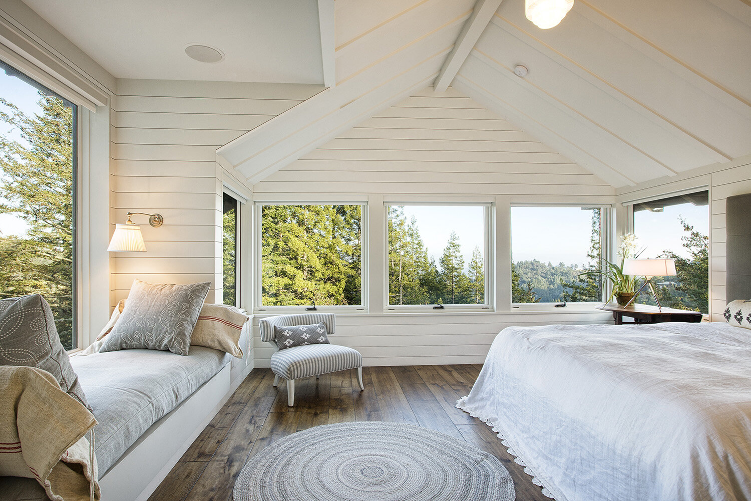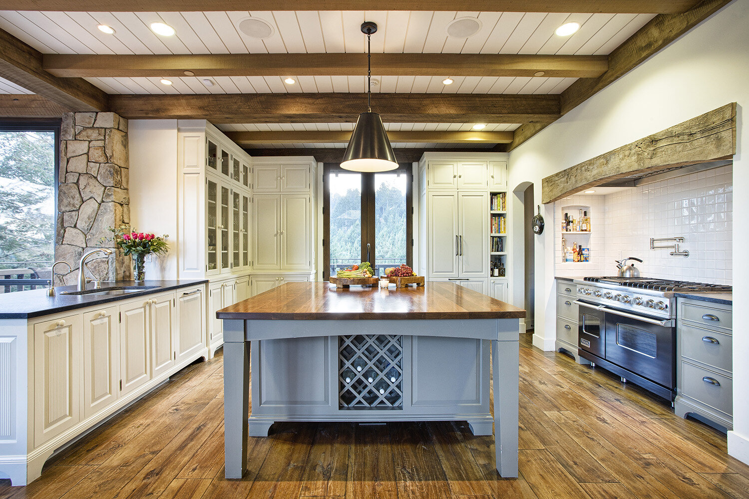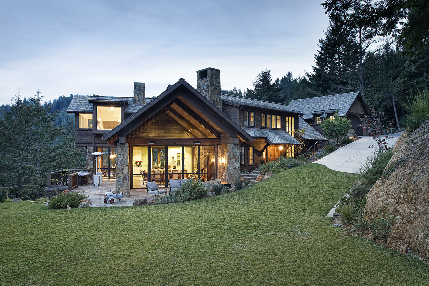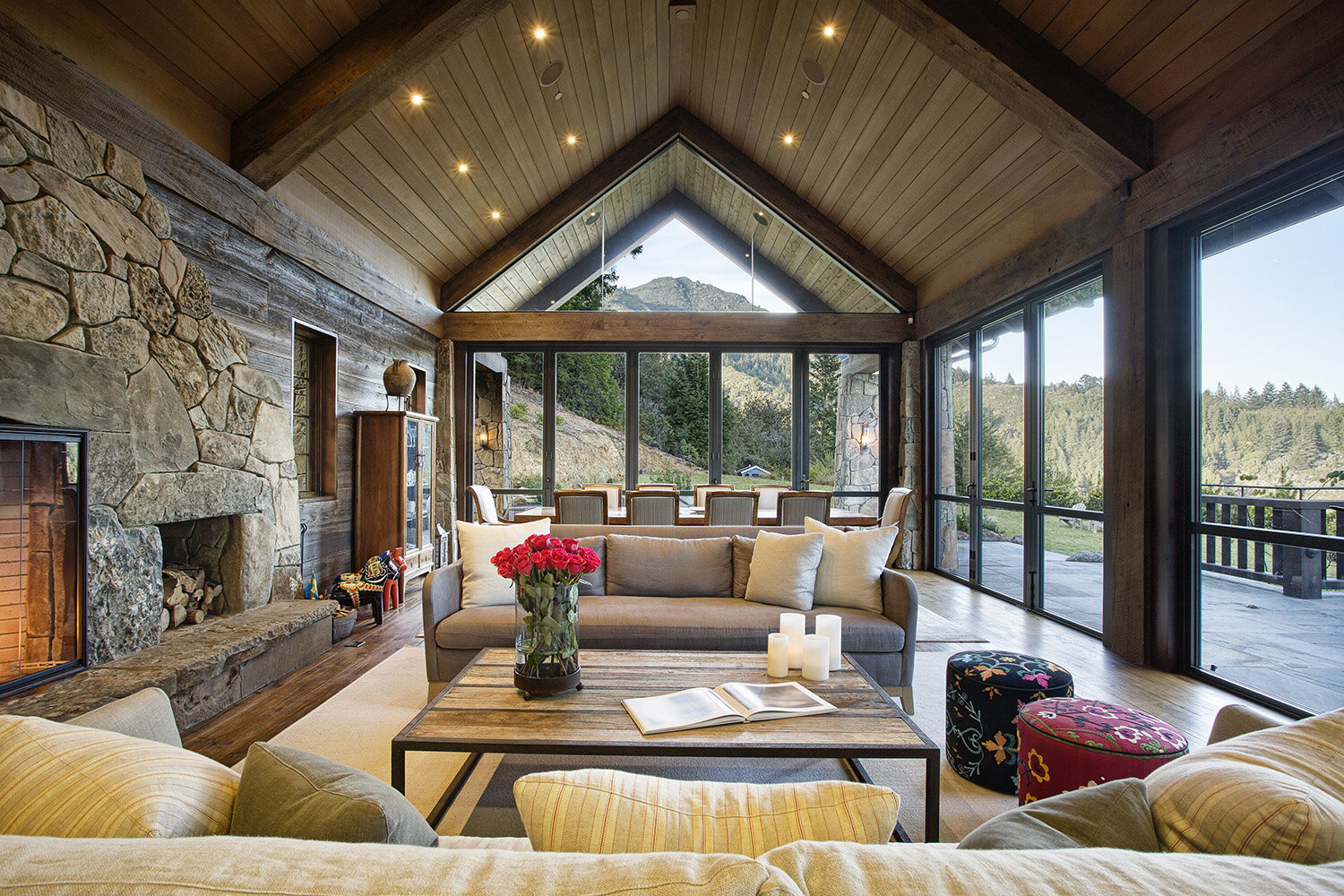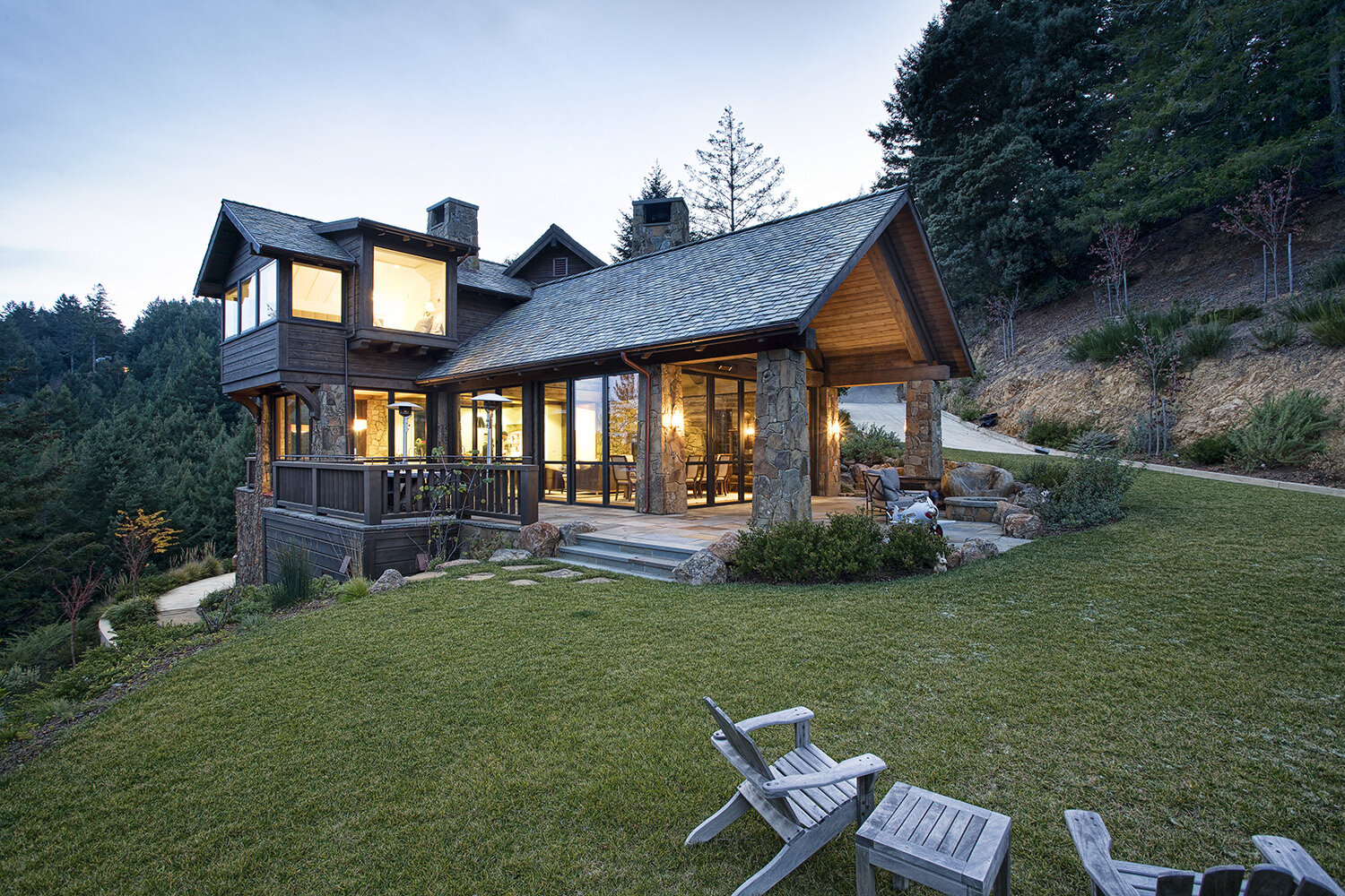 The charming chalet encapsulates a cutting-edge combo: it’s at once nestled-into-nature, and old-world opulent. The interior and exterior exude a flawlessly fluid feel, both boasting floor-to-ceiling glass, custom stonework, and classic wooden beams. Old-growth trees found only in NorCal’s nature scene add to the splendor of the grounds, visible from every vantage point, from the online-iconic “Reading Nook” to the sprawling lawn outside.