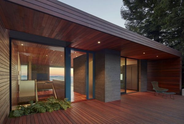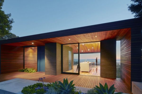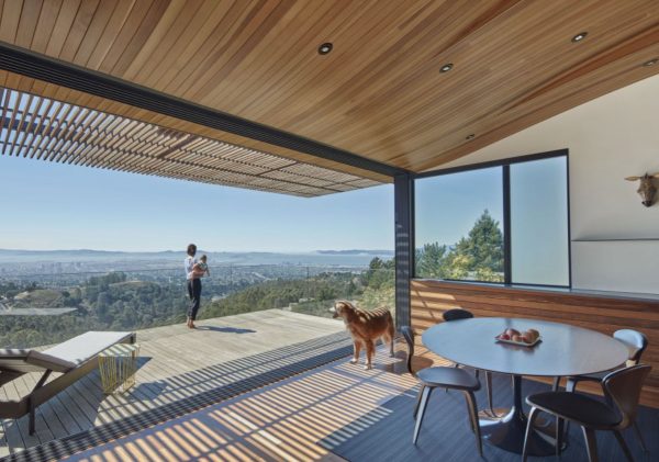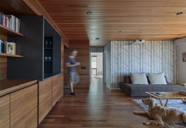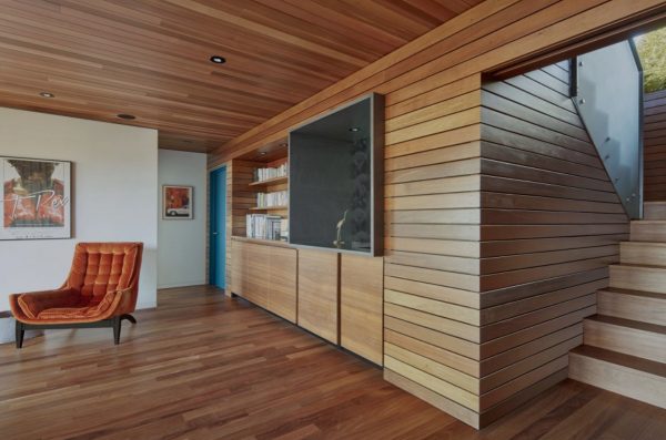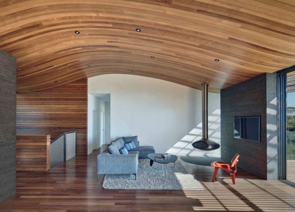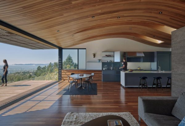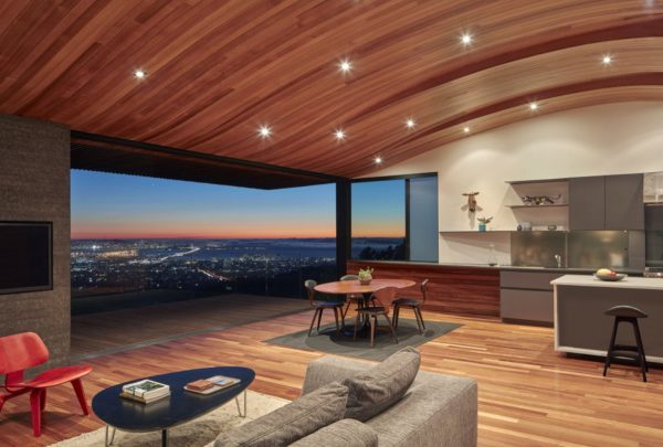 In this hillside haven, no matter the season, we’re walkin’ in a wooden wonderland. Simple styling and whimsical wood walls nod to the natural world, while floor-to-ceiling glass shows it off. Straightforward architectural lines contrast with swanky swoops overhead. Unexpectedly undulating, the curvaceous ceiling never upstages the urban-luxe landscape right outside.