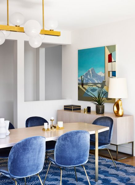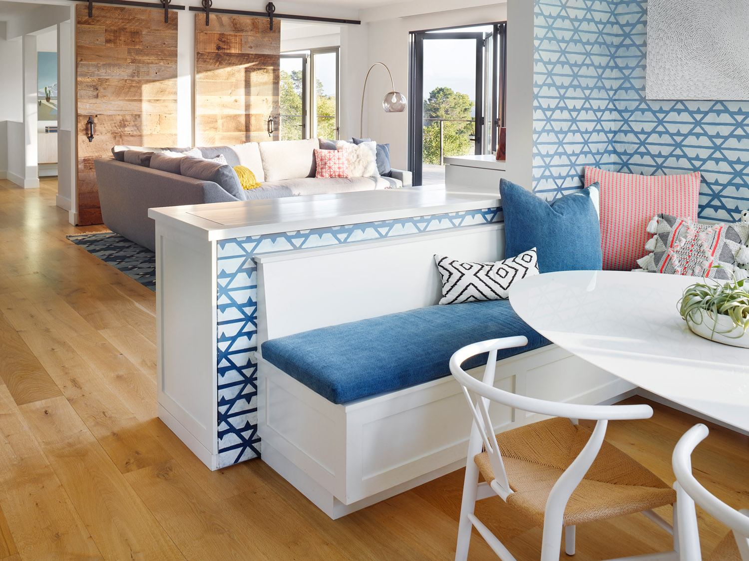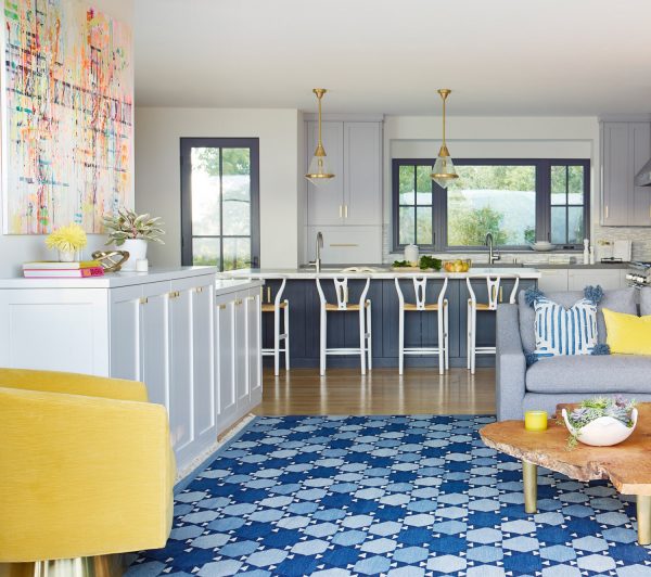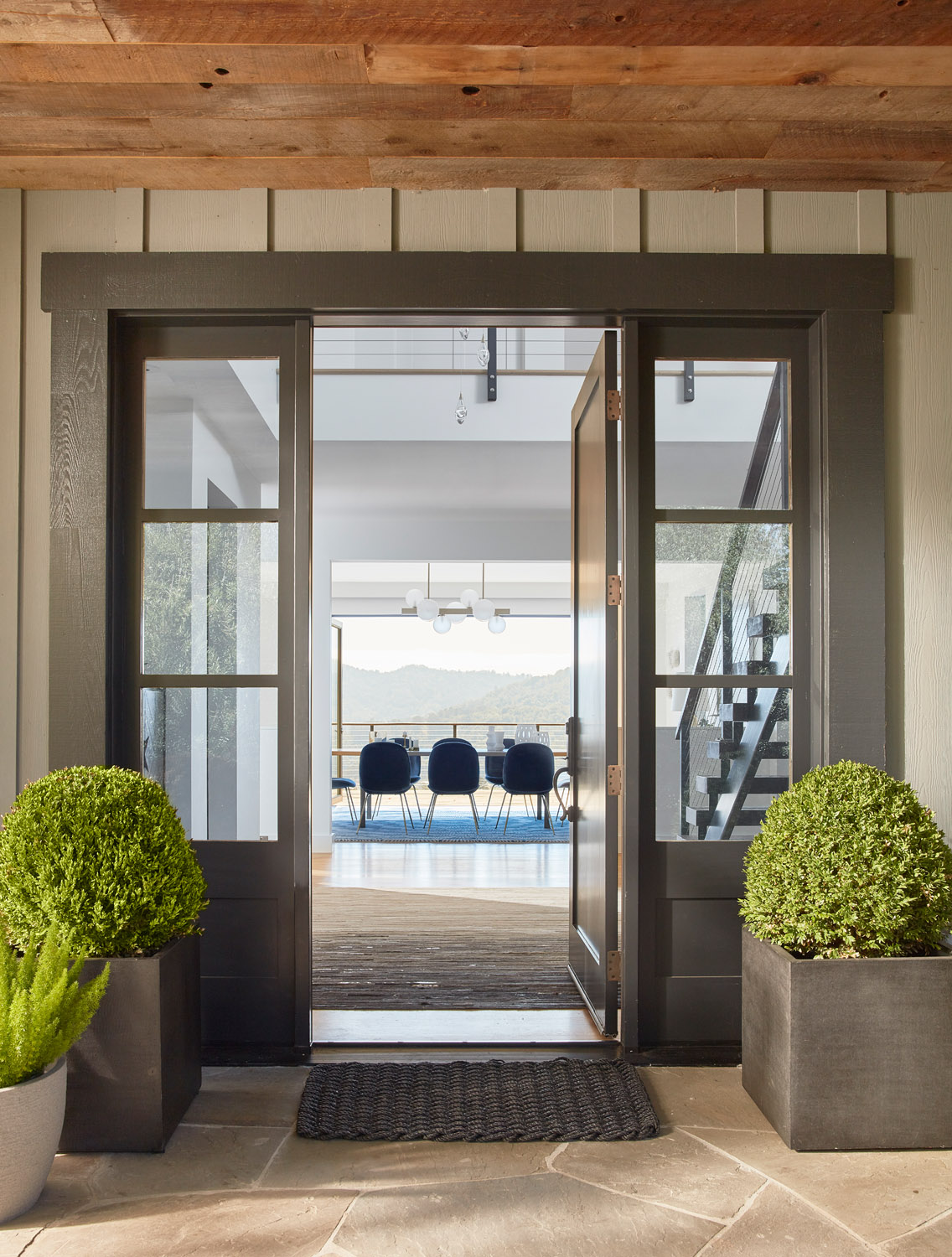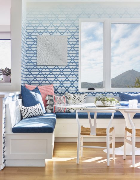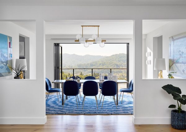 A family home is nestled in the mountains with extensive views of Mt. Tam. Sophisticated furnishings combined with cheerful colors create an east coast meets west coast feeling throughout the house.