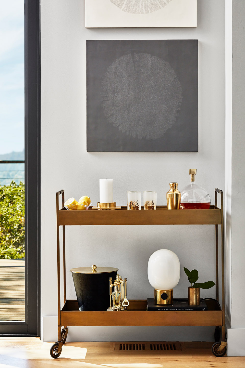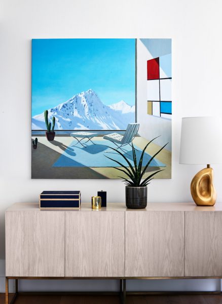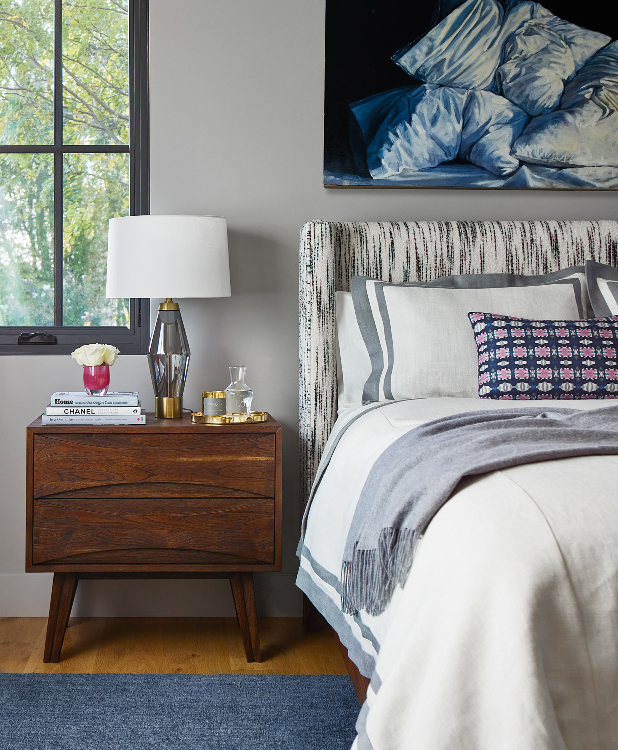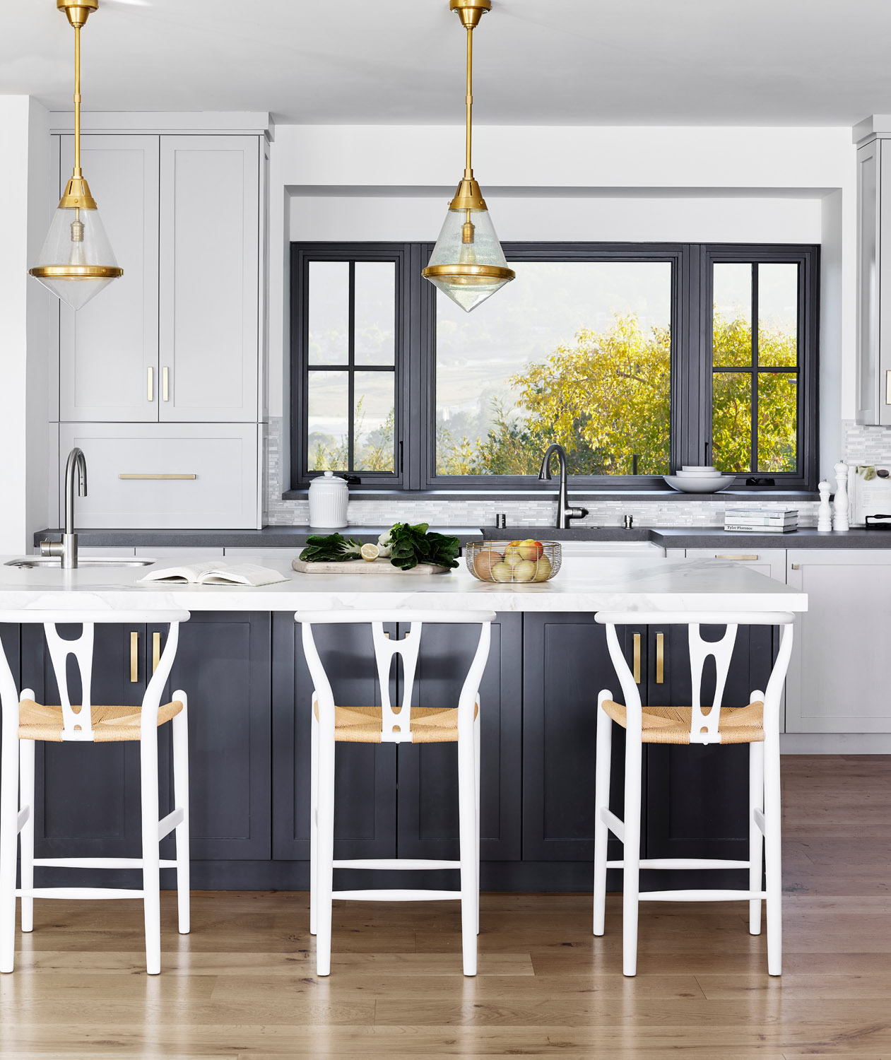 A family home is nestled in the mountains with extensive views of Mt. Tam. Sophisticated furnishings combined with cheerful colors create an east coast meets west coast feeling throughout the house.