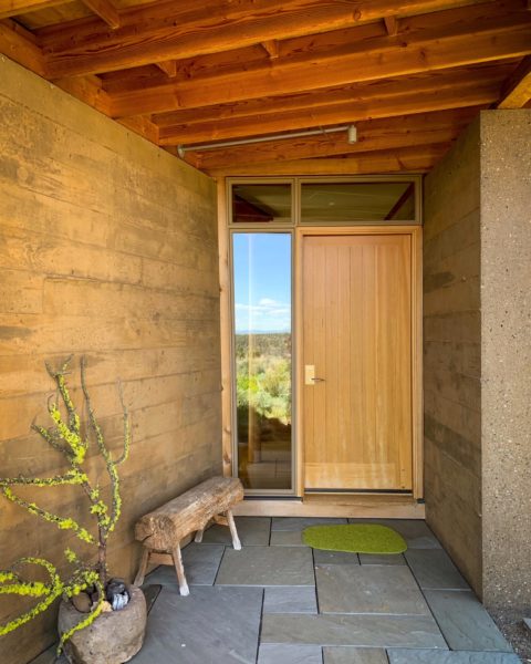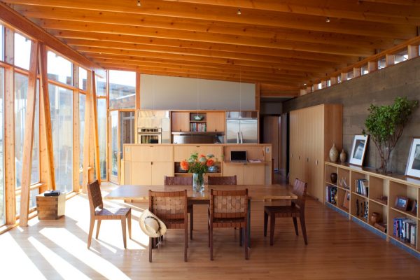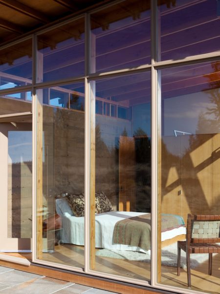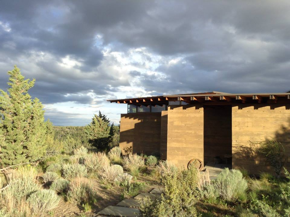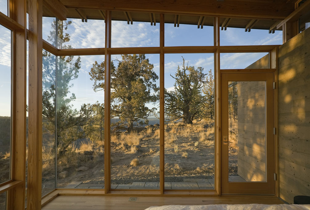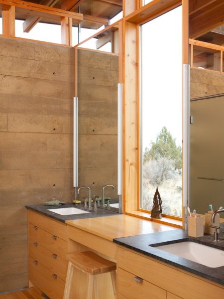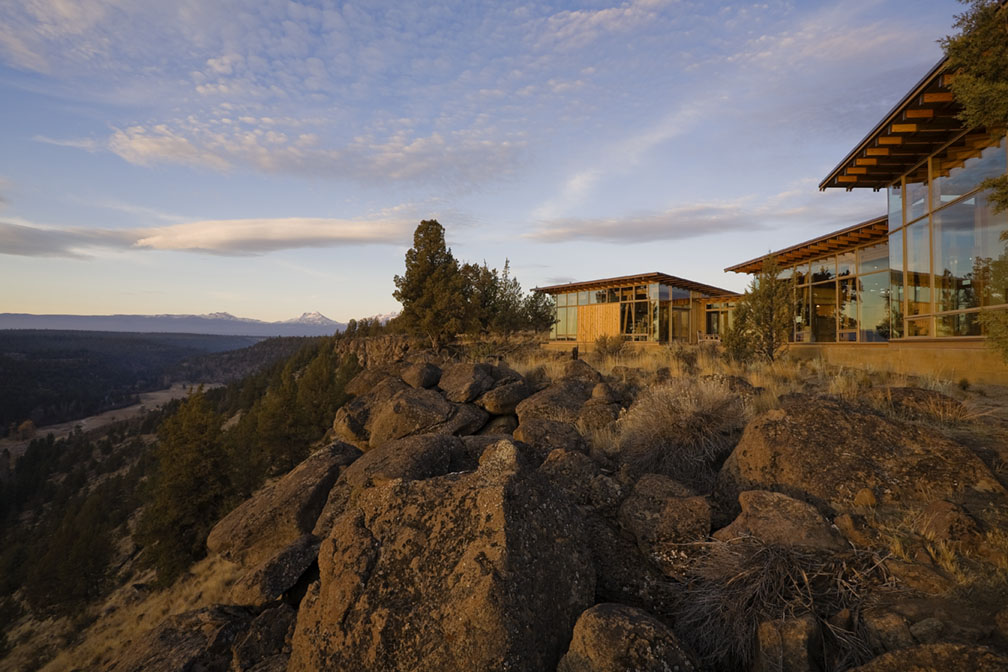 Surrounded by juniper, bitter brush and sage, the house is designed no higher than the vegetation encircling it. Board formed concrete walls – colored to match the land – present a camouflaged, solid face to the desert entry. The east face, in contrast, features floor-to-ceiling glass and opens to the rim of a massive basalt canyon and distant mountain views. Three living areas inhabit the concrete spine. The living room, dining room, kitchen and laundry comprise the center section. Down long hallways in either direction are the master bedroom and bath and a guest room, guest bath and gym/office. Two bluestone terraces offer canyon views and infinite opportunities for lounging, dining and entertaining.