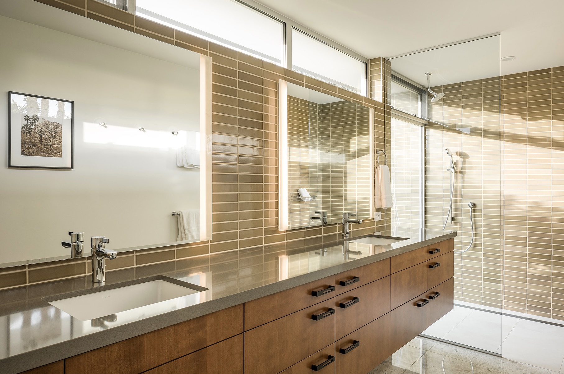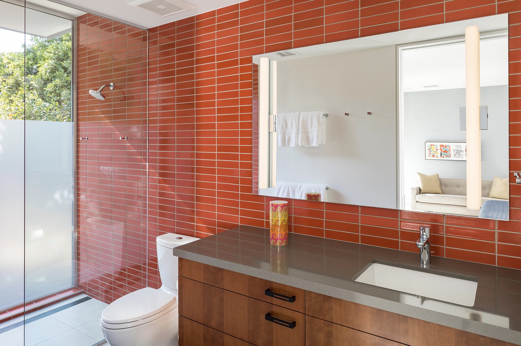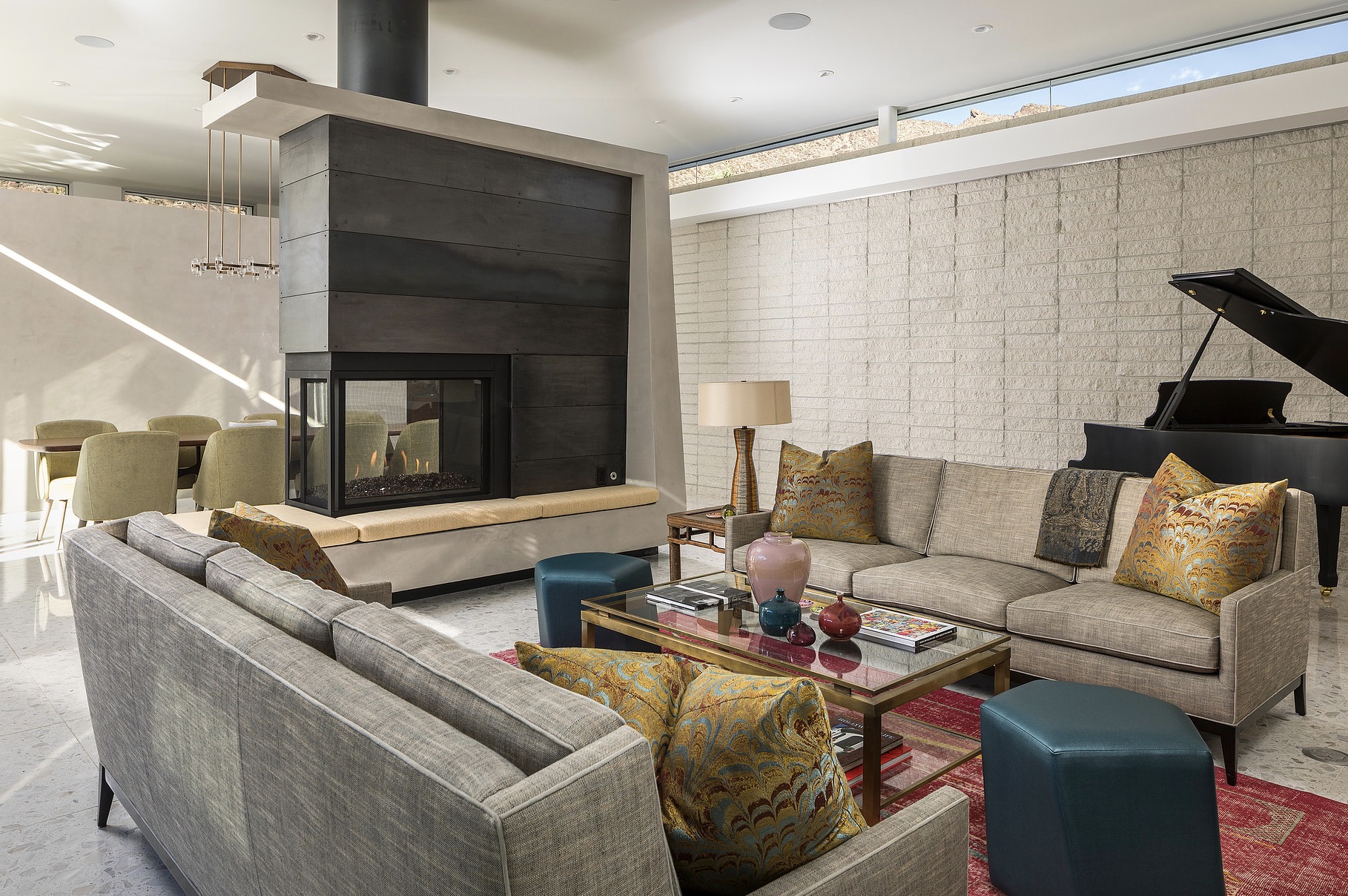 It’s not just a mirage: the cool colors, elegant angles, and understated glam of this Palm Springs palace might just transport you back a century or so. Tones of sapphire sparkle in the luxe lap pool, while tangerine tiles jazz up the outdoor shower. Between retro rugs and fab fireplaces, open-concept architecture accentuates the fluidity between decor and desert.