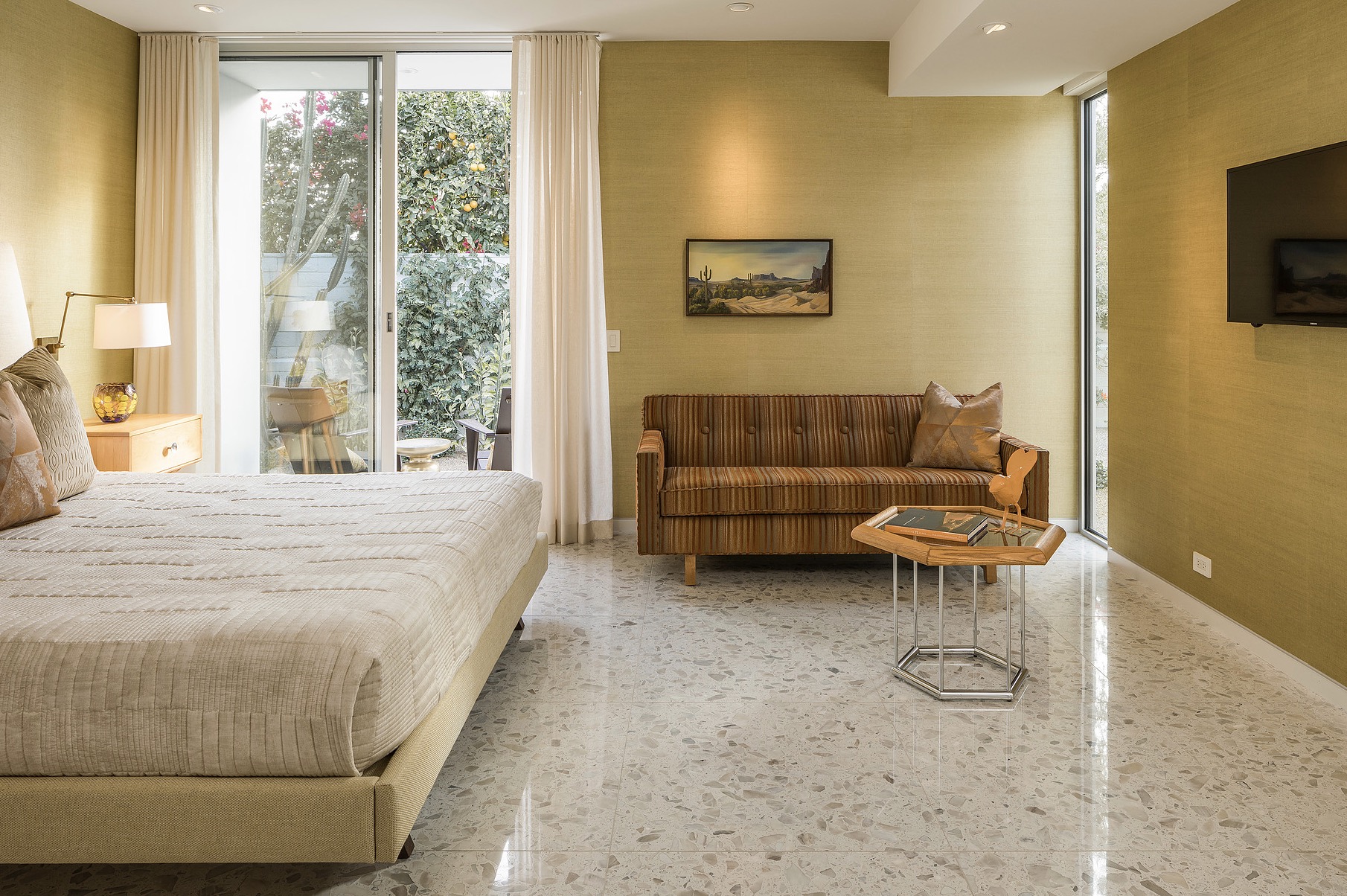 Thank you, floor-to-ceiling glass! Natural light everywhere adds allure to tasteful color pops peppered throughout the space. They might technically be in the background, but the craggy, clay-colored peaks visible from every part of the property steal the show. Lush green gardens outside offer a stunning sensory counterpoint to the dry heat and sublime sunlight.