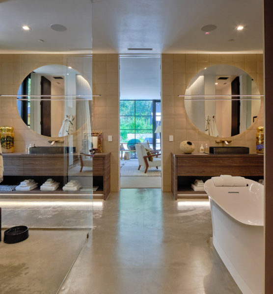 Did someone say, “avant-garden?” This estate’s every inch invites relaxation, from rooftop decks to poolside patios! Pristine and palatial, the property offers opulent outdoor landscape complete with a consummate chef’s kitchen, a sleek fire pit, and a glam guesthouse with retractable glass walls. From quartz countertops to posh polished concrete, sparse, upscale decor inspires images of enticing innovation in a spa-like setting.