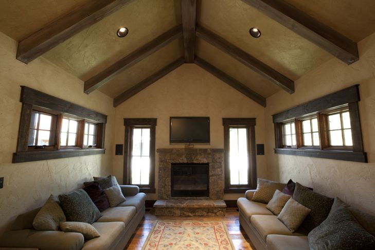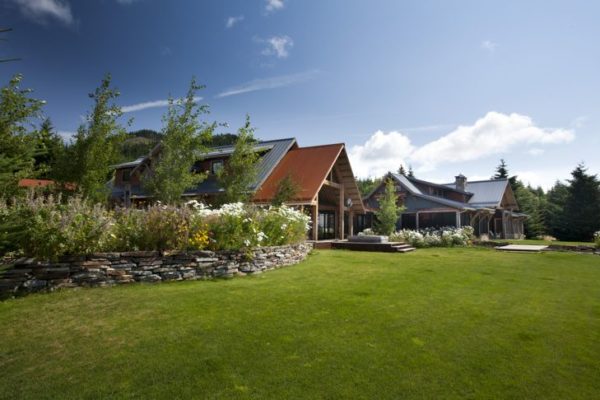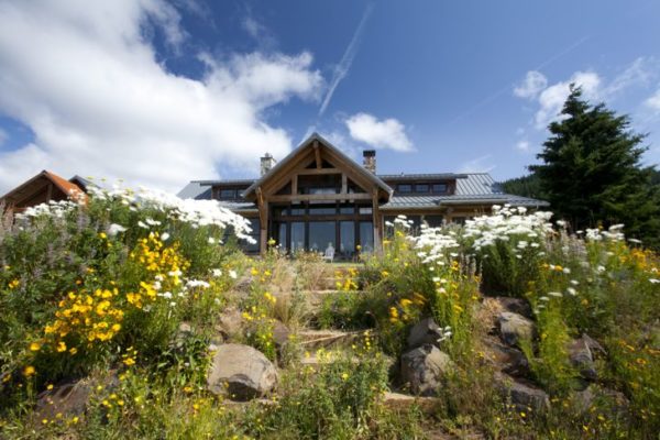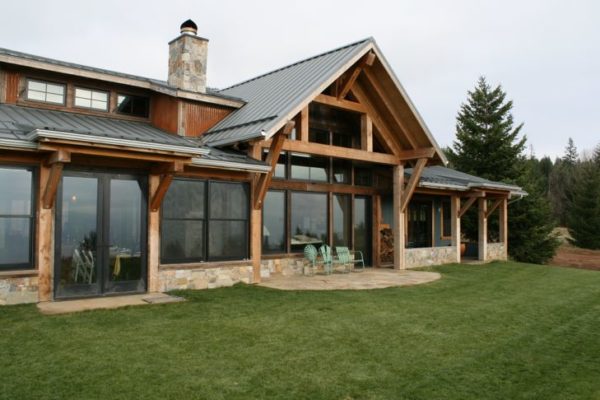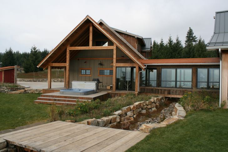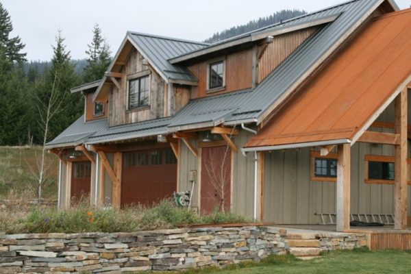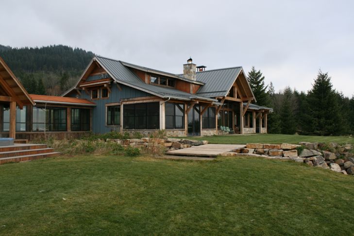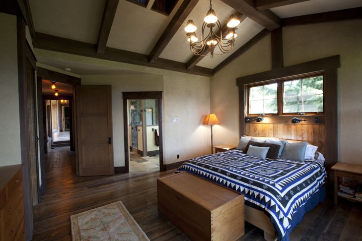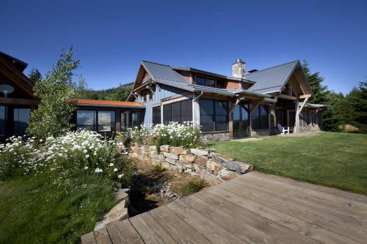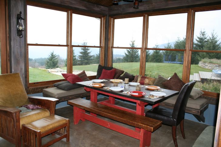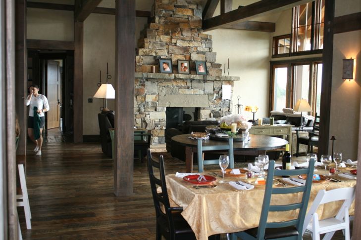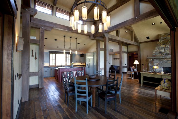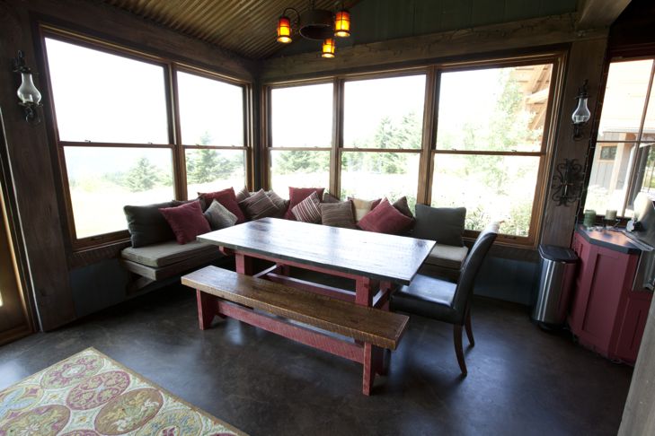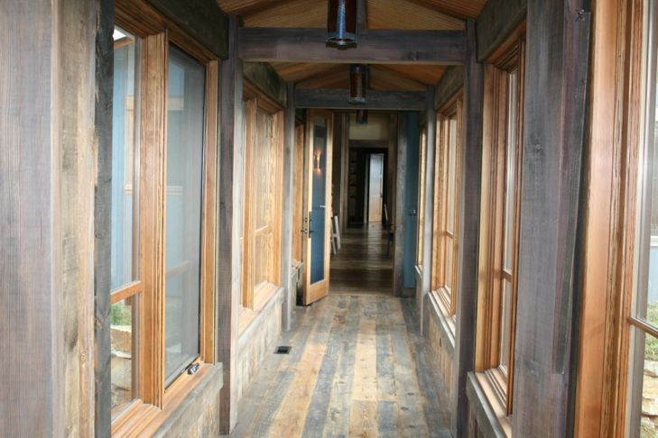 This house was designed to take in the surrounding scenery and south facing light. The sun rises and sets over an interior of reclaimed barn wood, rock and rusted tin. Lighting imported from Italy keeps the rooms glowing at night.