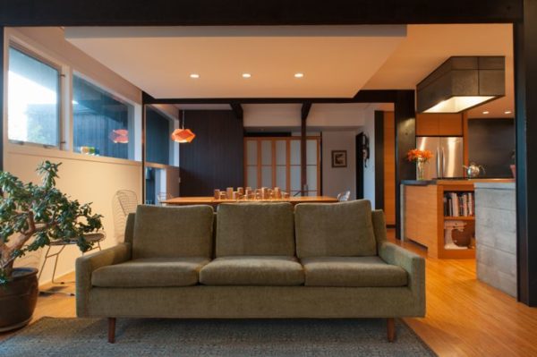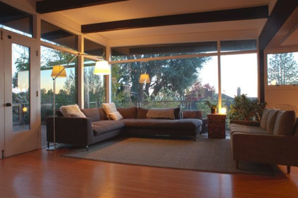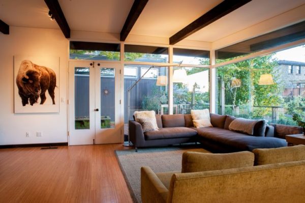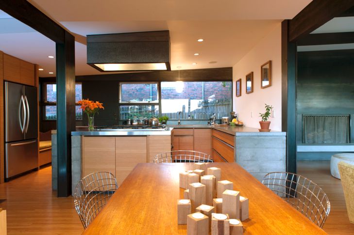 Large windows and French doors let the light shine into an inviting open floor plan. Striking details of wood beams, warm fir floors and brushed metal surfaces create a contemporary tribute to a well-loved architectural style. The furnishings compliment the era-influenced style.