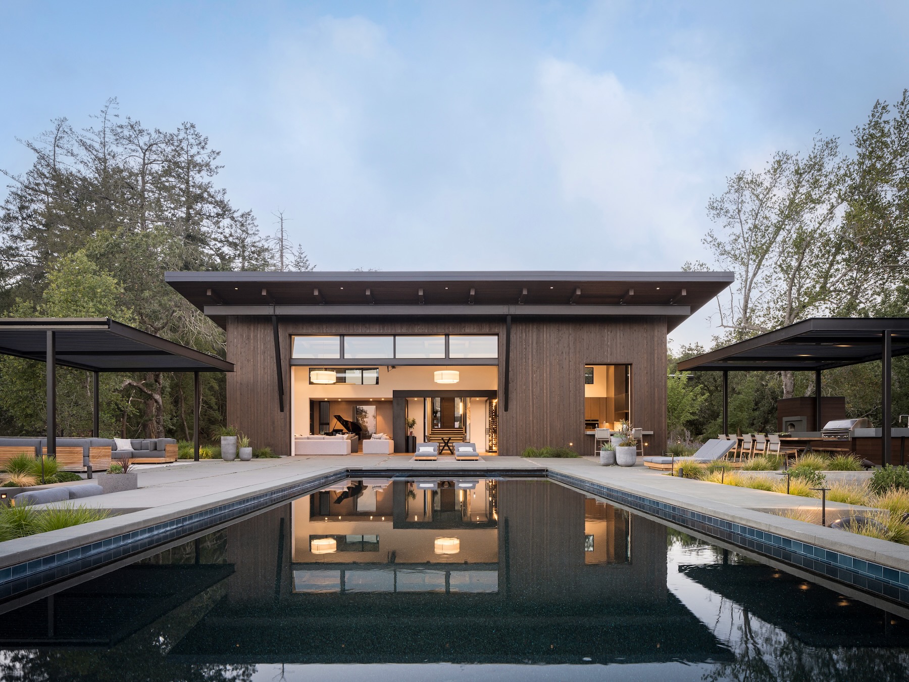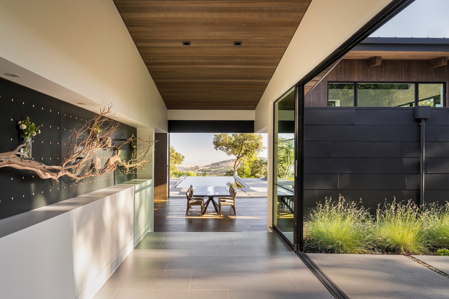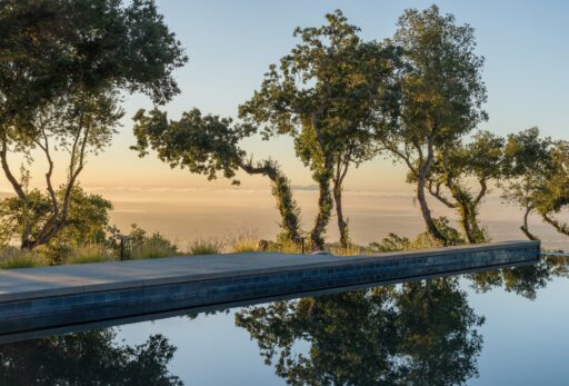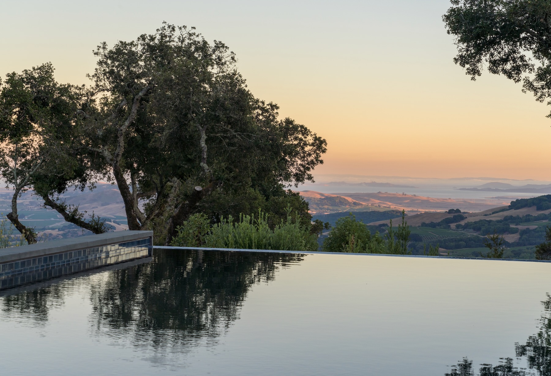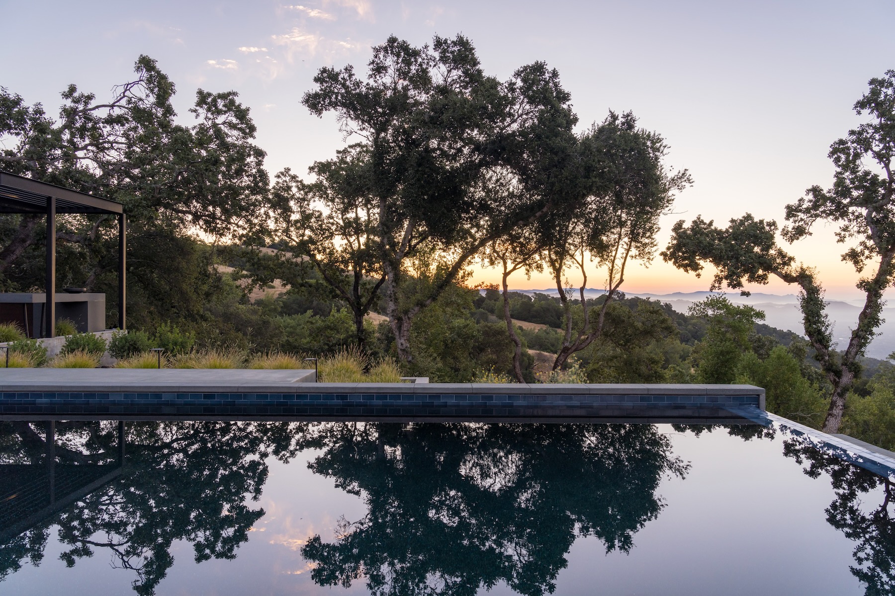 This architectural stunner flows with the land, leading to a vanishing-edge pool with a backdrop stretching to San Francisco.