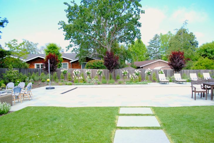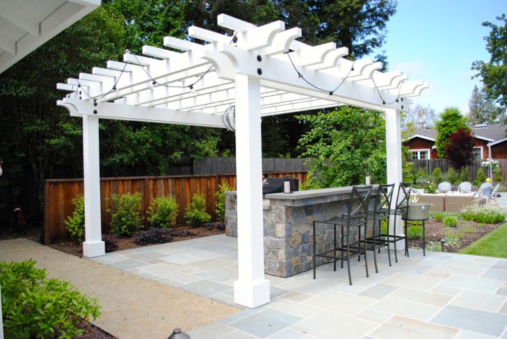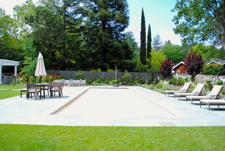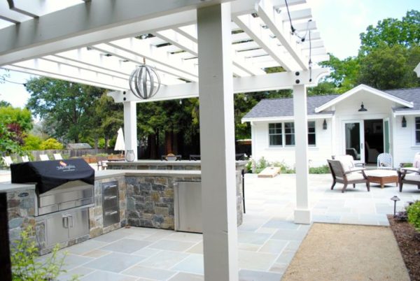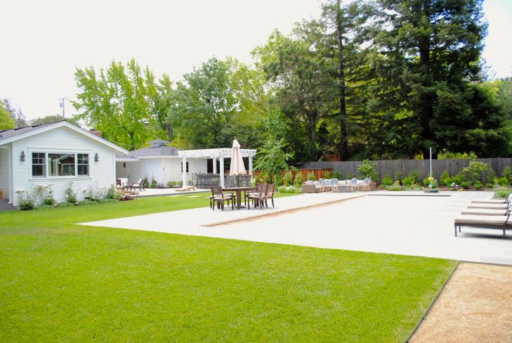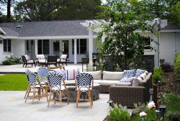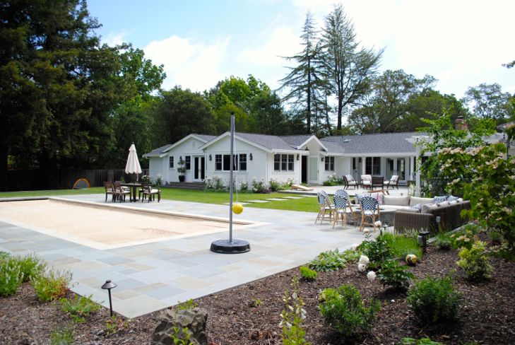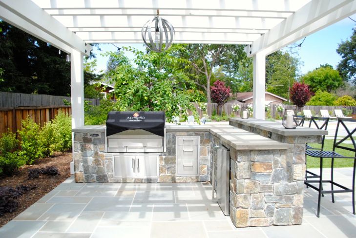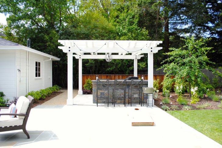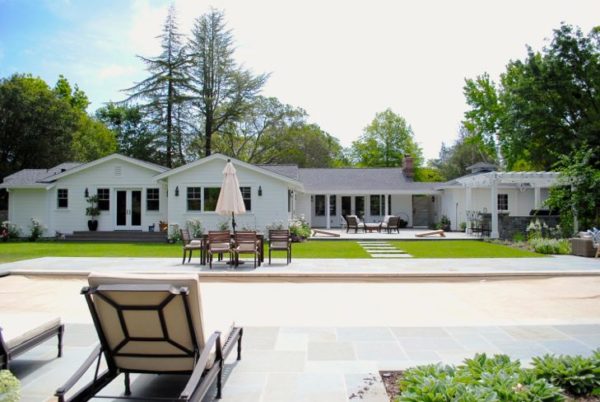 A traditional East Bay home with upscale details, including white marble countertops, high ceilings in the main living areas, and a beautifully tiled rear patio area with a pool, stone wet bar and outdoor seating.