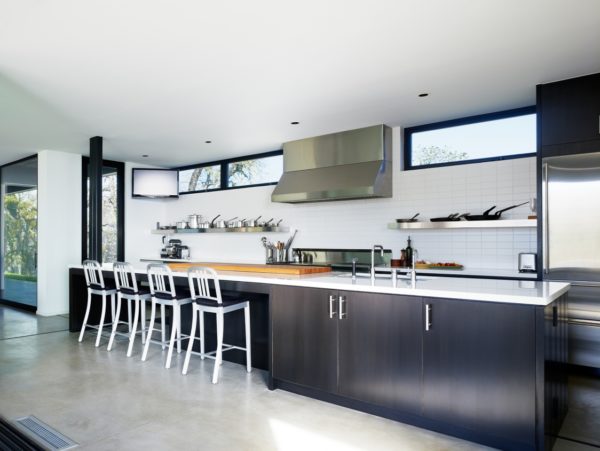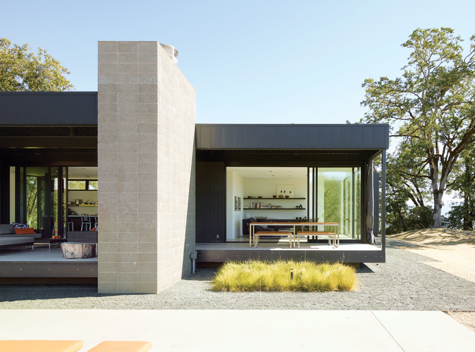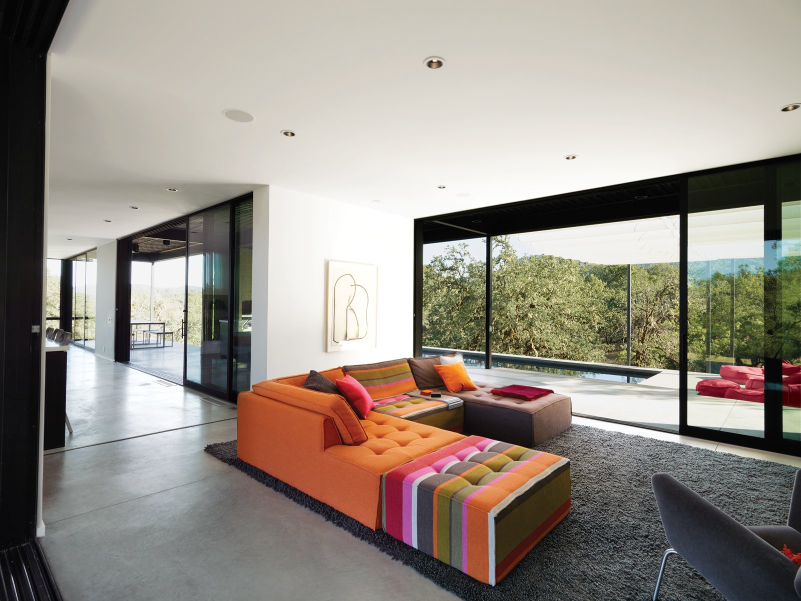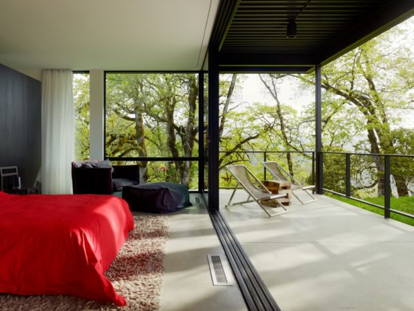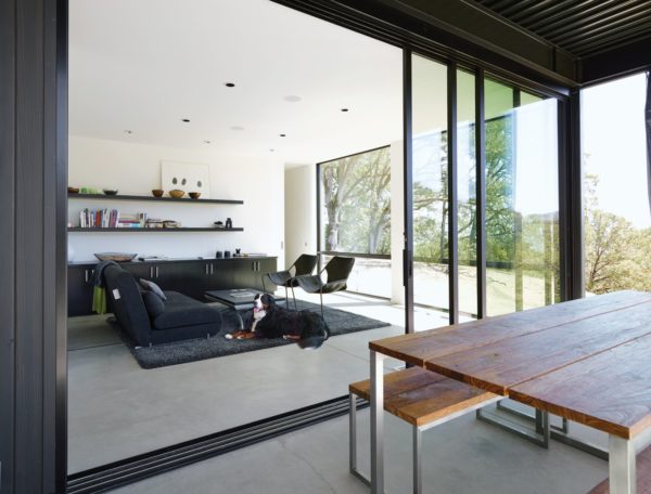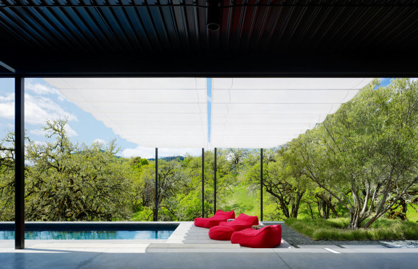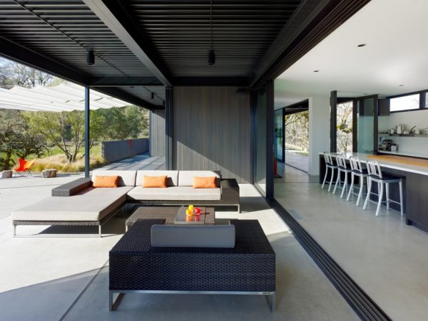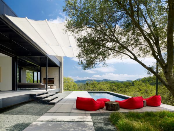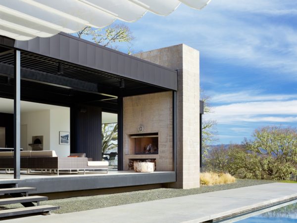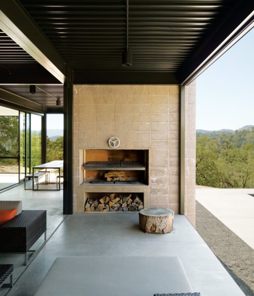 Outdoor features include sweeping views, a pool, 1,400 square feet of covered deck, and a fireplace that doubles as a wood-burning grill. The 2,200-square-foot, two-bedroom home consist of concrete floors, and retractable glass walls that create seamless indoor-outdoor living. Despite the contemporary look, the house blends seamlessly with the landscape.