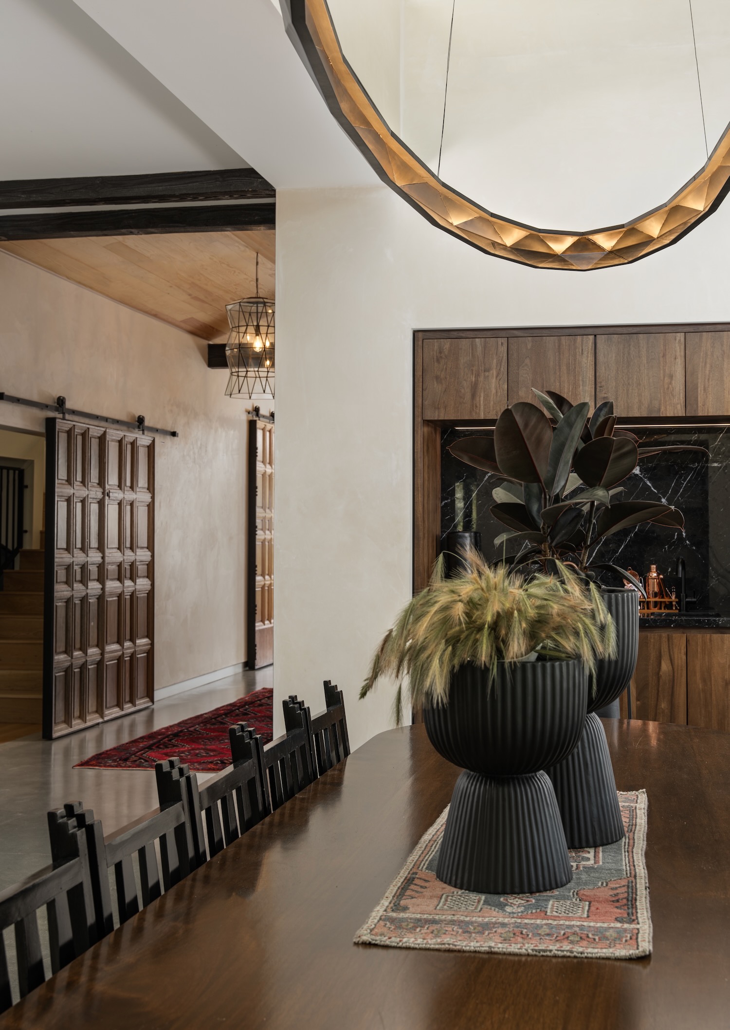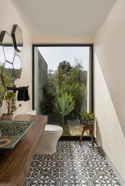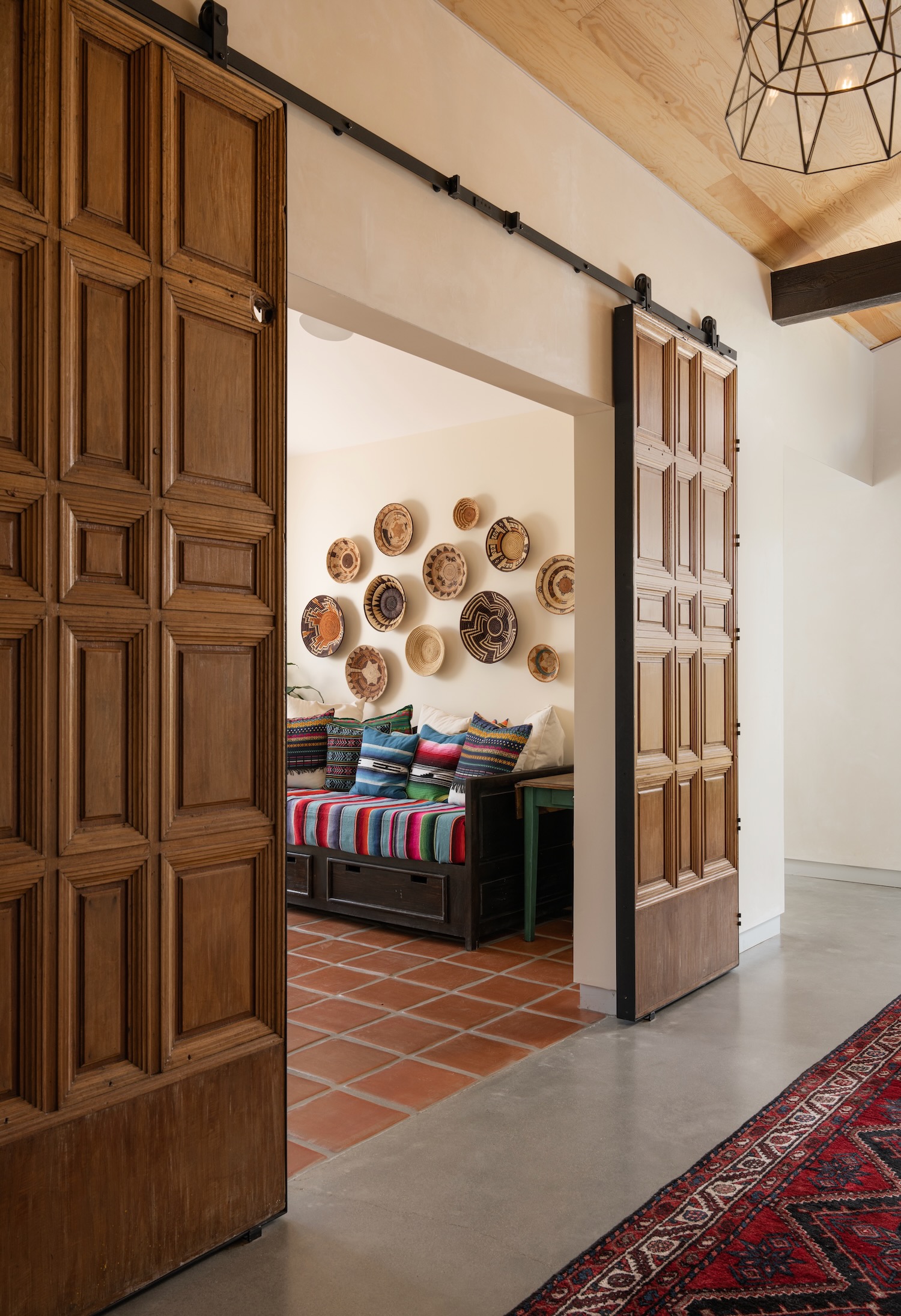 Traditional design meets modern aesthetic! Juxtaposing the clean neutral palette of a modern space with bold splashes of handmade mexican tiles, textiles, and hand carved antique furnishings.