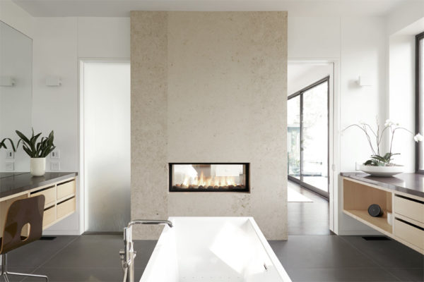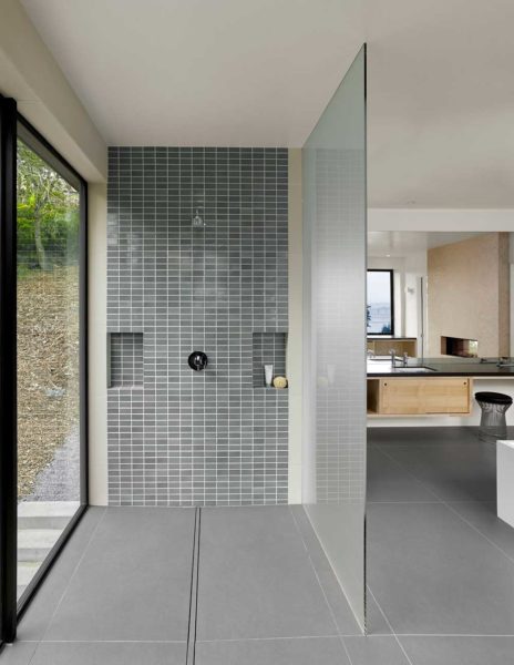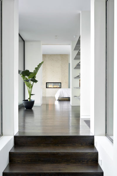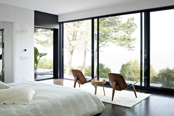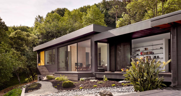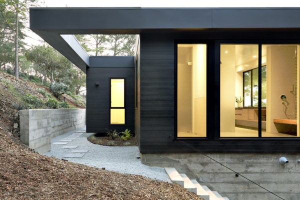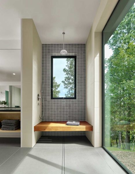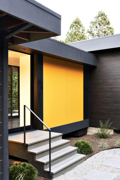 The Details: Subtle tones of celadon, slate grays and creams infuse the decor with an Asian air. Fossilized limestone tiles and dark wood floors ground the interior allowing for the nine foot floor to ceiling windows to capture the changing light from dawn to dusk. A flat roof line and wood siding materials camouflage the exterior so the home appears seamless with the environment – aside from the bold poppy colored door panel which greats visitors with a smile.